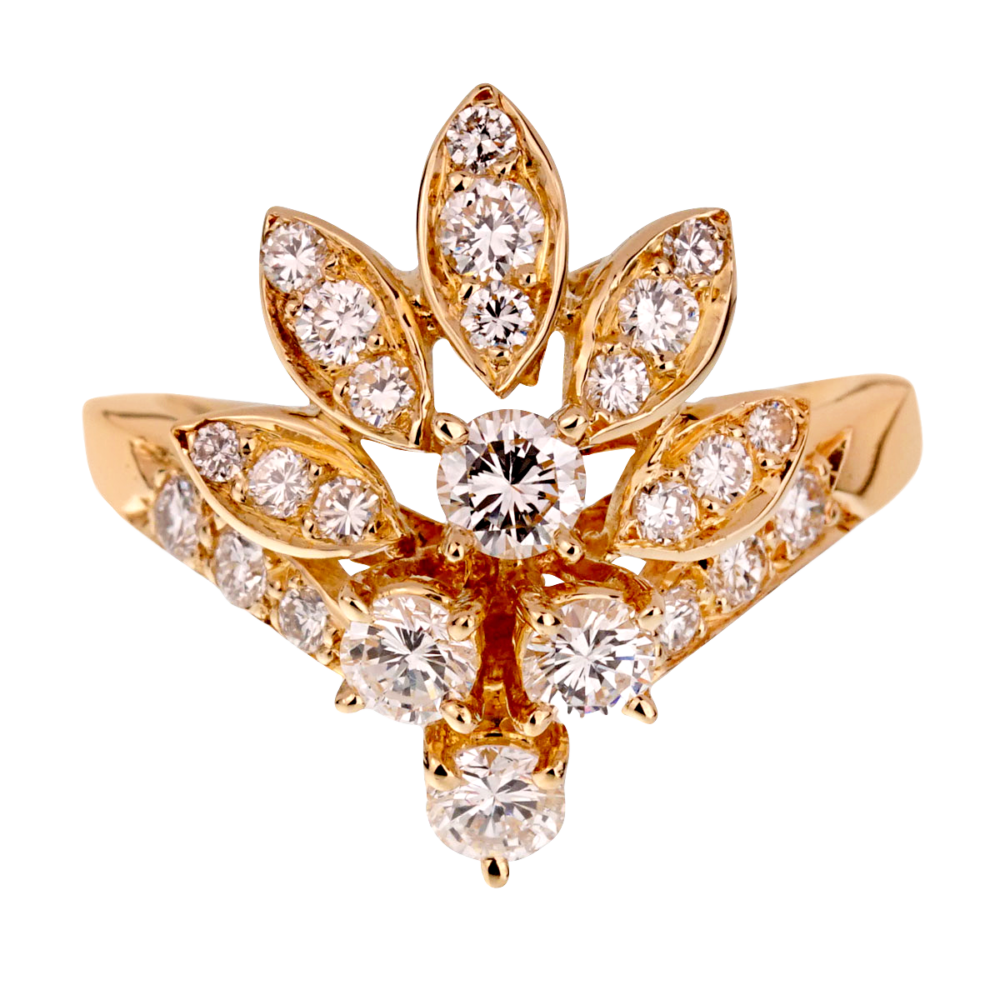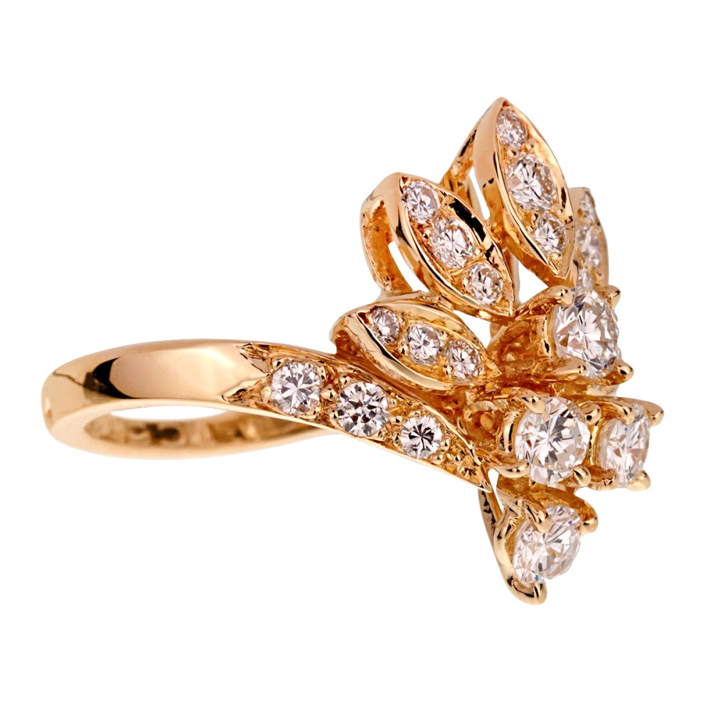 Designed as a spray of diamond set leaves surrounding 3 round diamonds.