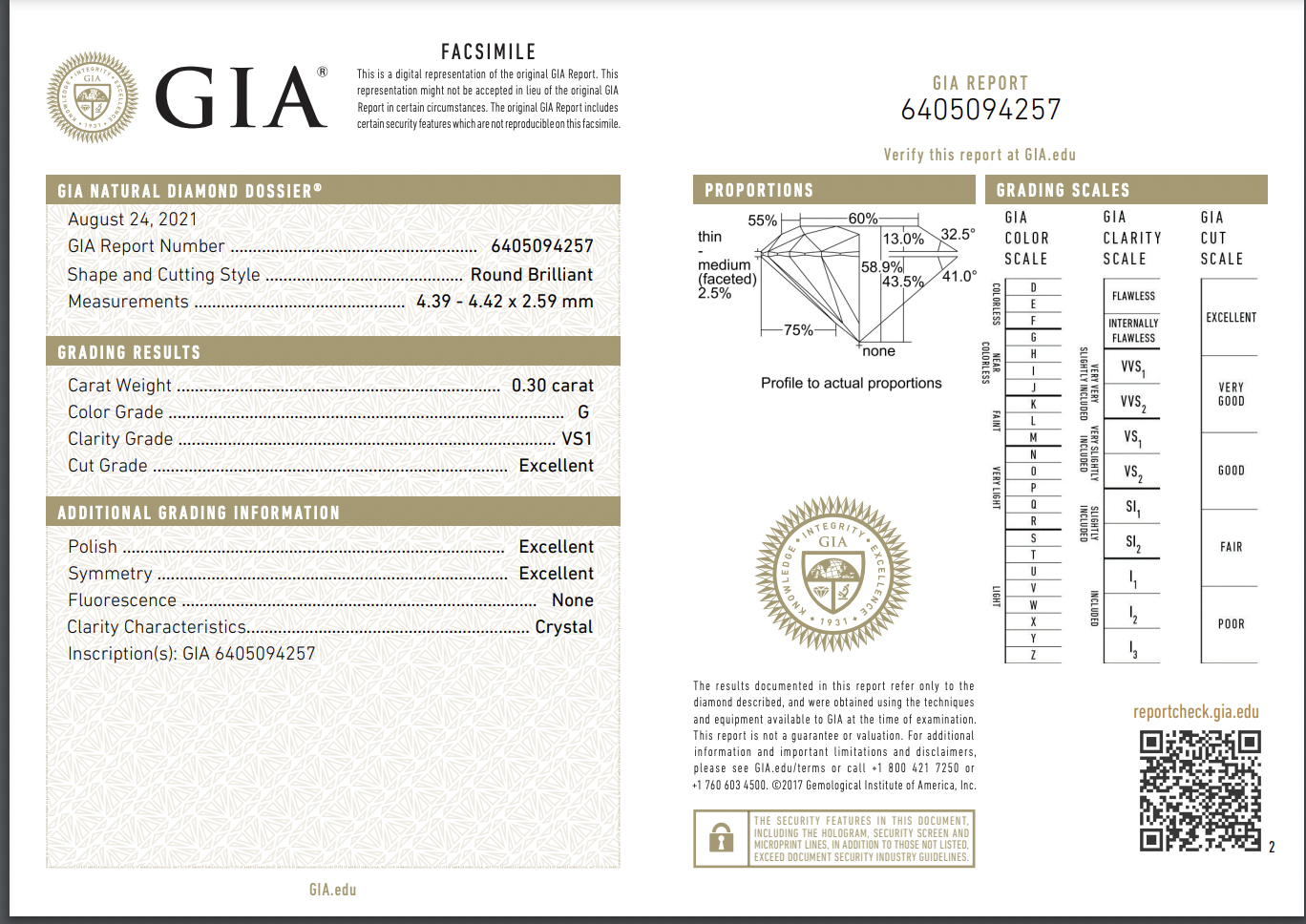 - Accompanied by GIA report no. 6405094257, stating the 0.30 carat diamond is G color and VS1 clarity, excellent cut with no fluorescence