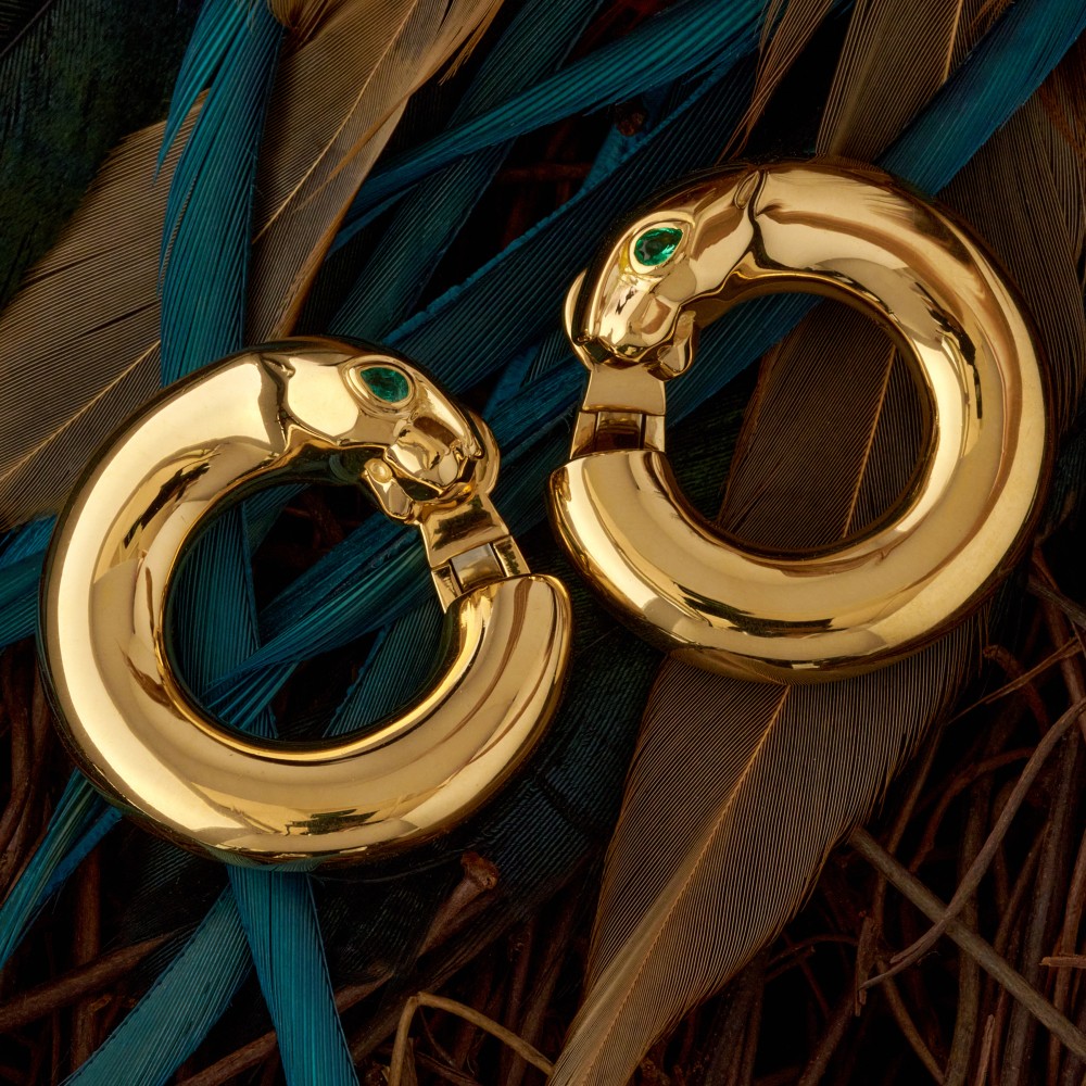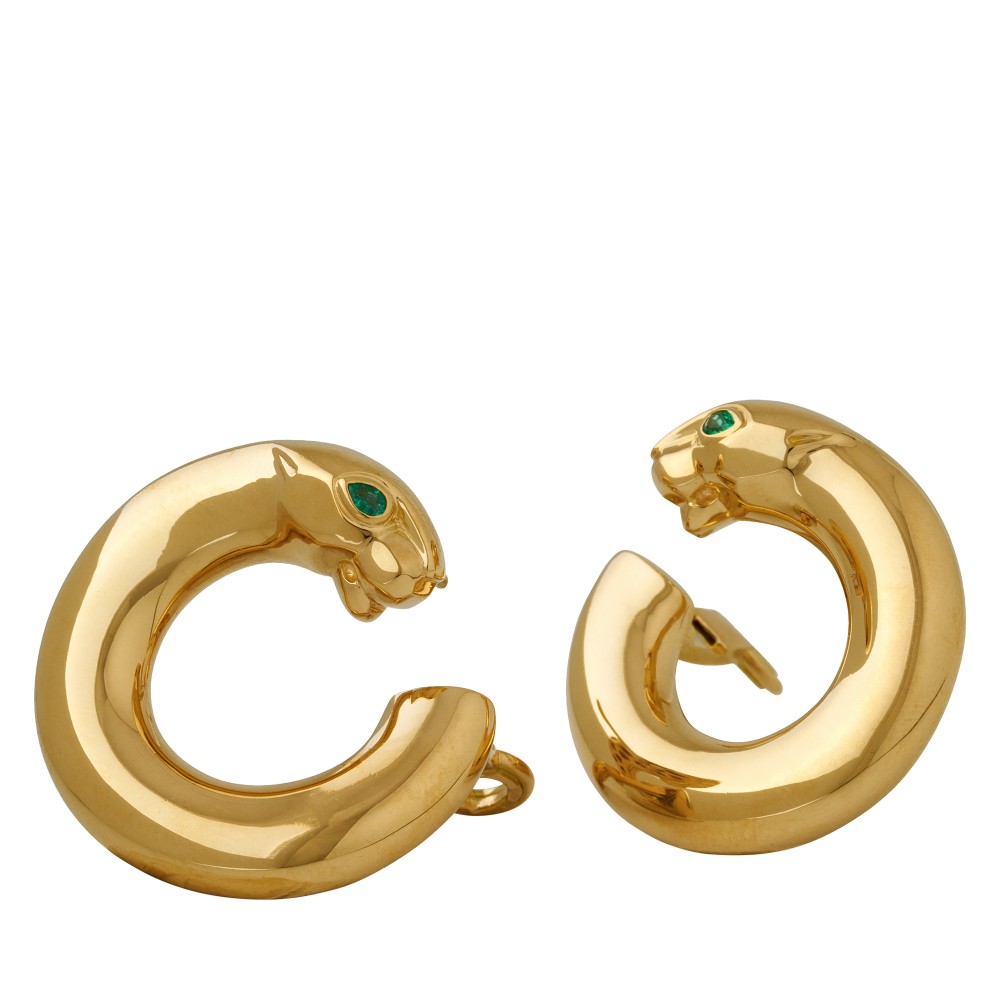 Composed of pear-shaped emeralds set in gold as the eyes of a panther.