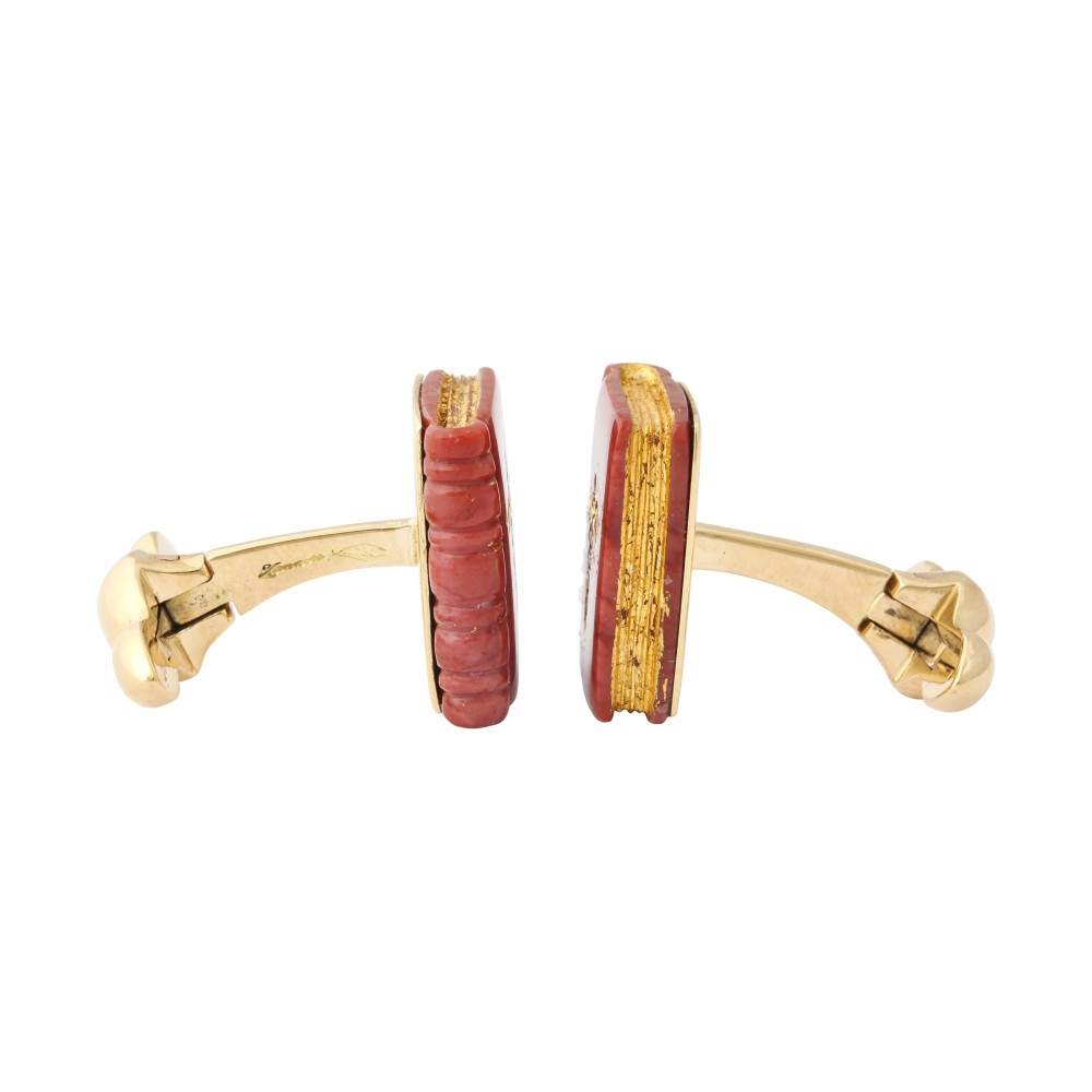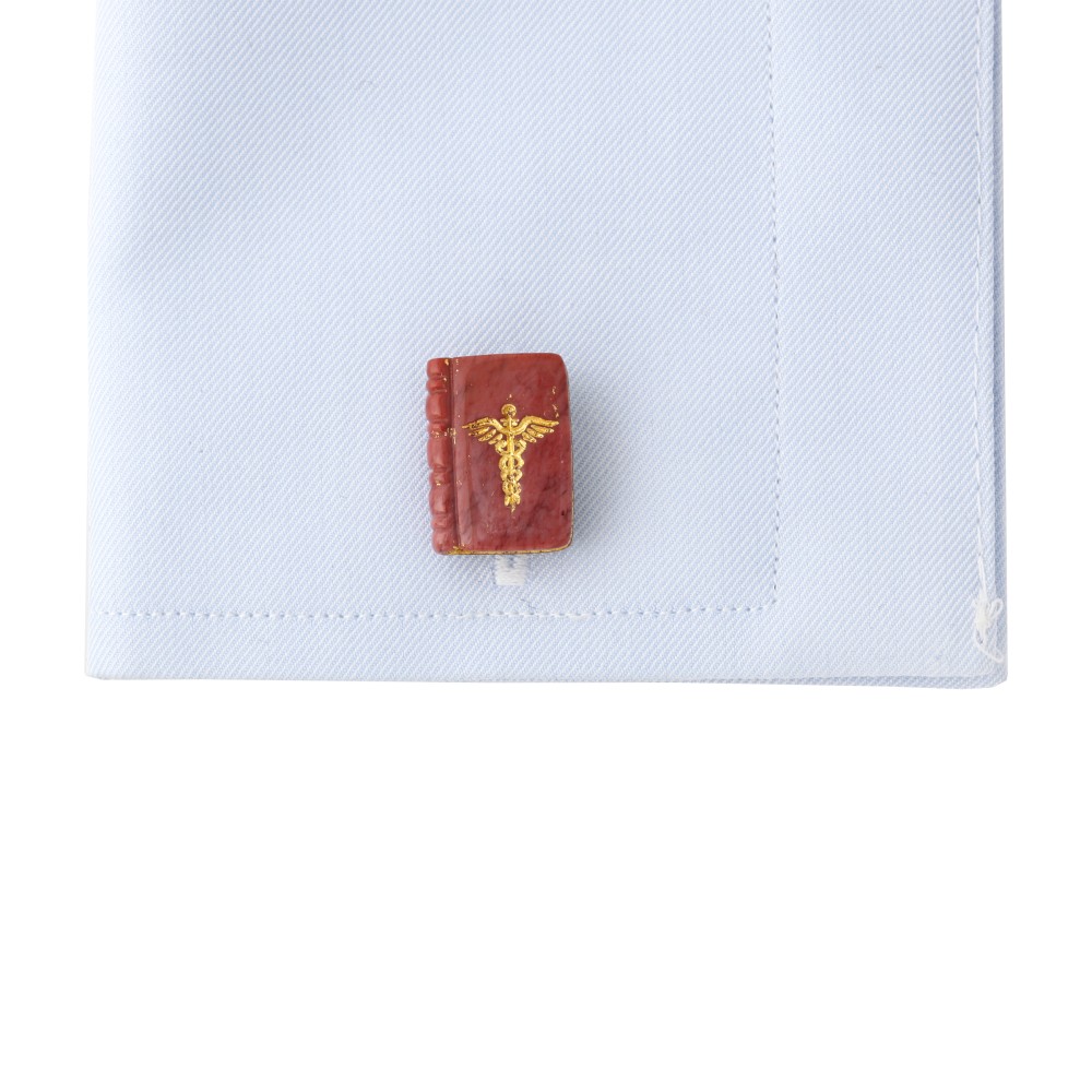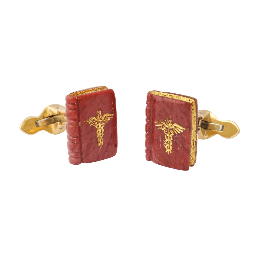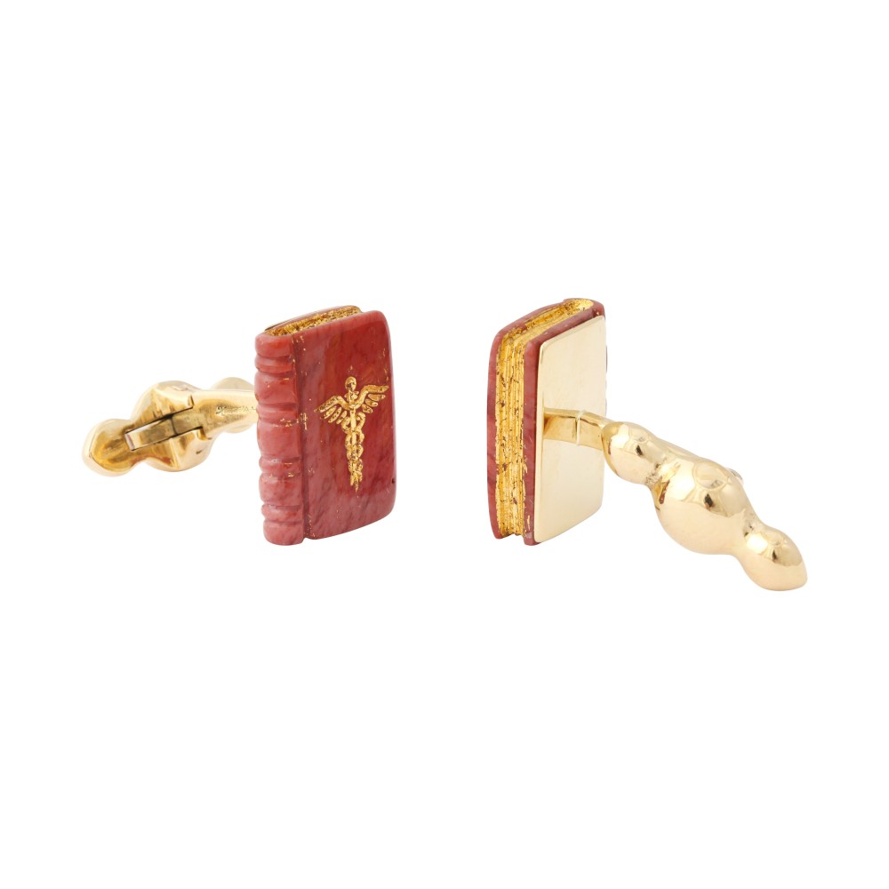 Designed as caduceus books, composed of hand-carved brown jasper with inlaid gold caduceus and gold spring backs.