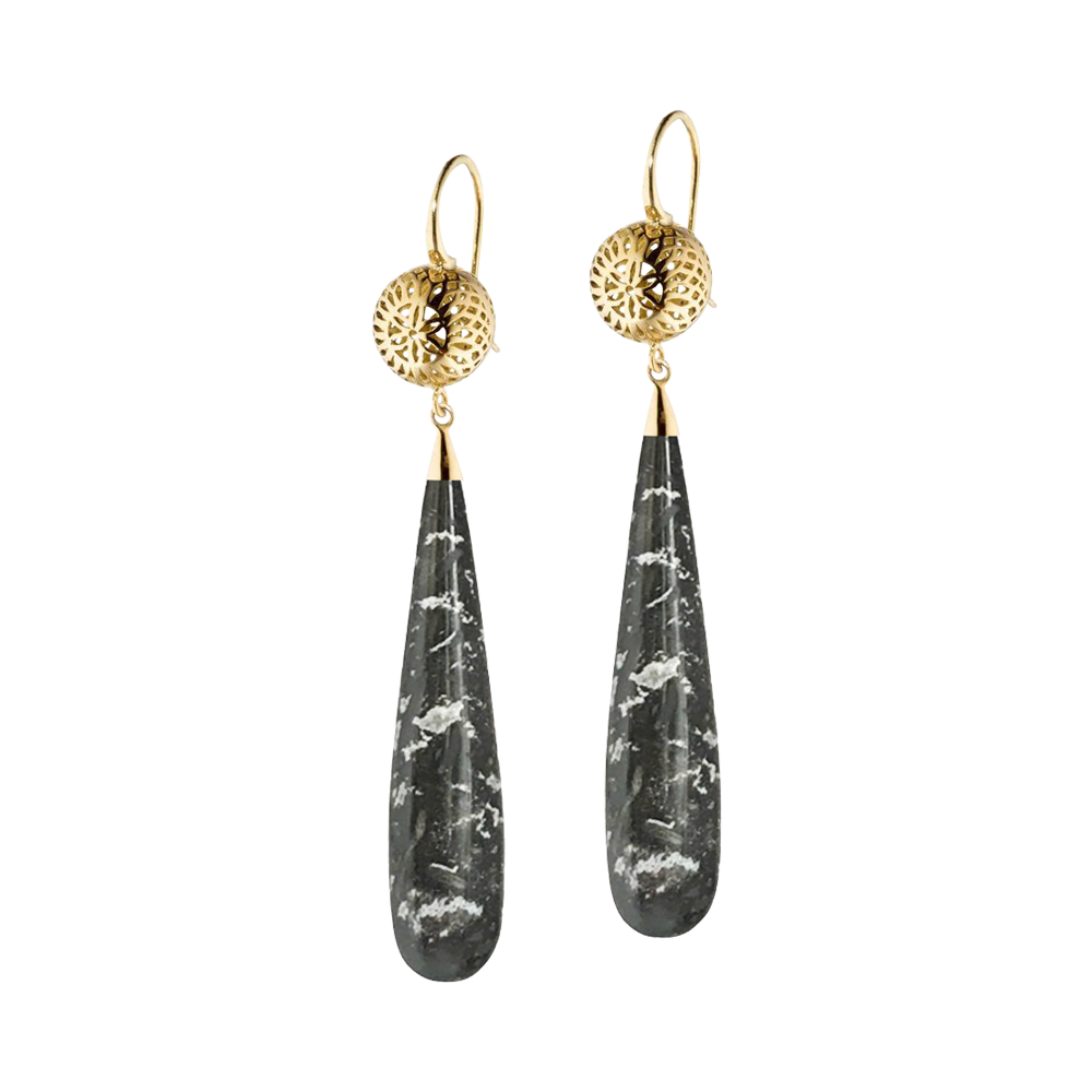 Featuring the grid-like pattern ball, suspended by jasper drops.