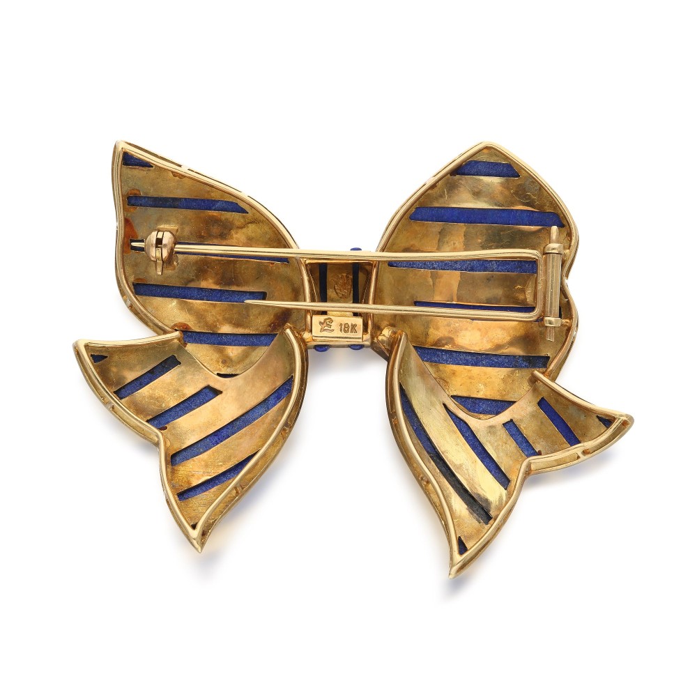 Designed as a bow, accented by lapis lazuli.