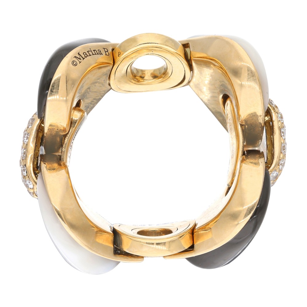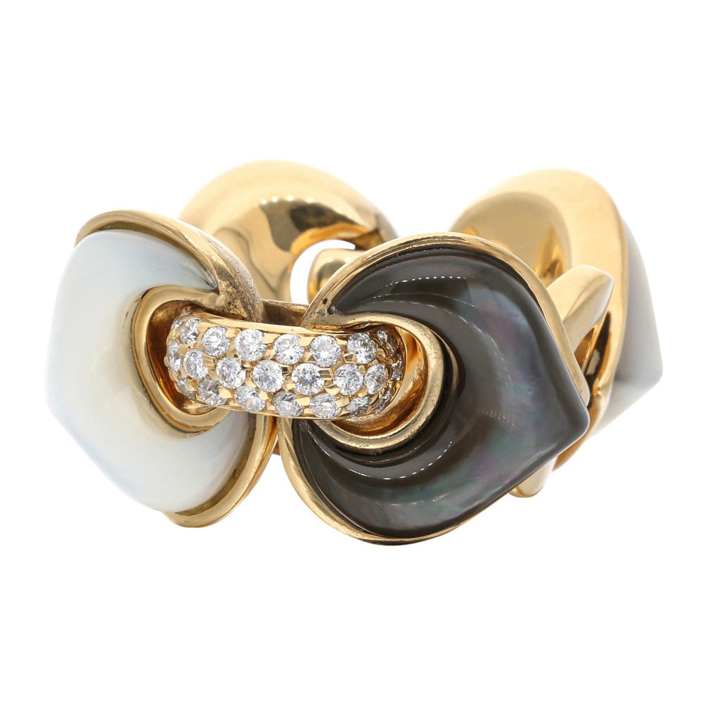 Composed of black and white mother of pearl, accented by round brilliant cut diamonds.