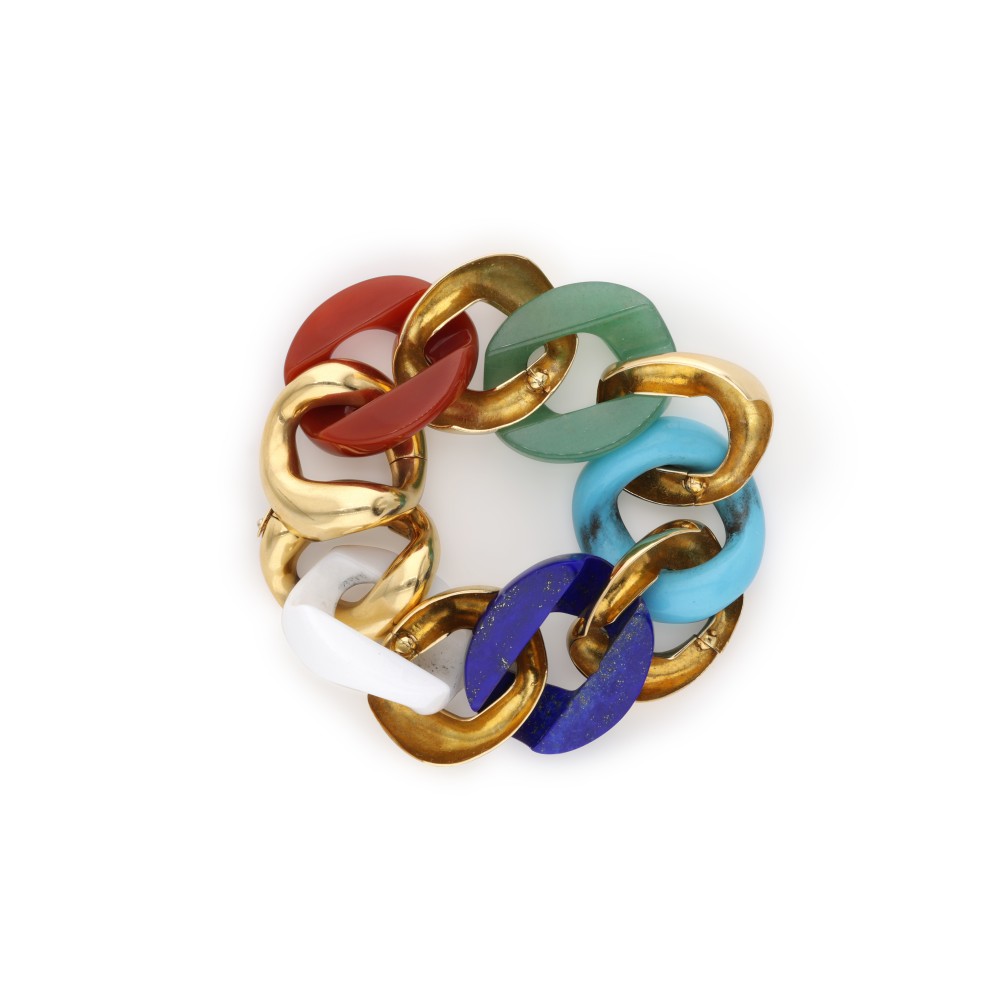 Composed of carved carnelian, aventurine quartz, turquoise, lapis lazuli and white agate links.
