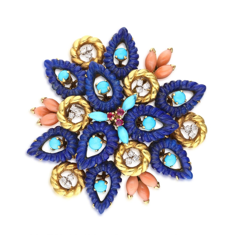 Composed of carved lapis lazuli, coral and turquoise cabochons, round-cut rubies and single-cut diamonds.