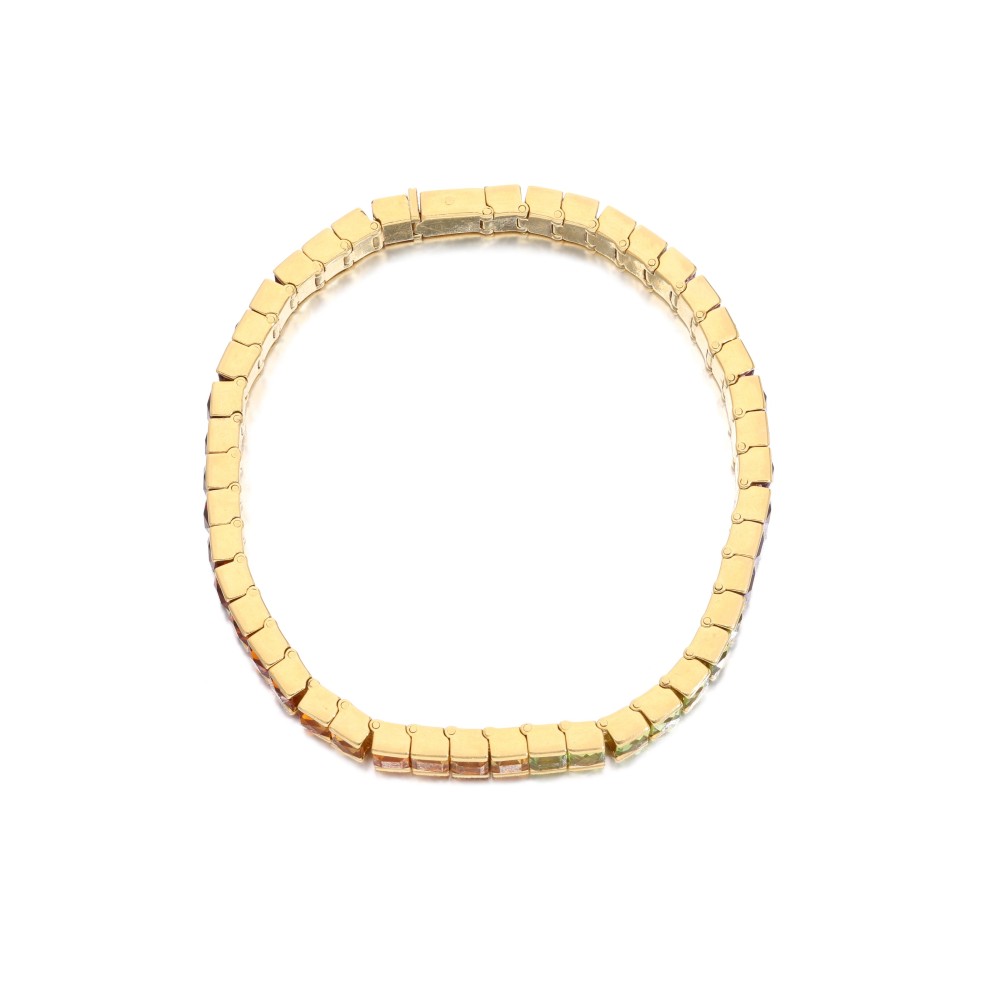 Composed of square-shaped topaz, amethyst, green tourmaline, citrine and garnet, arranged as a rainbow.