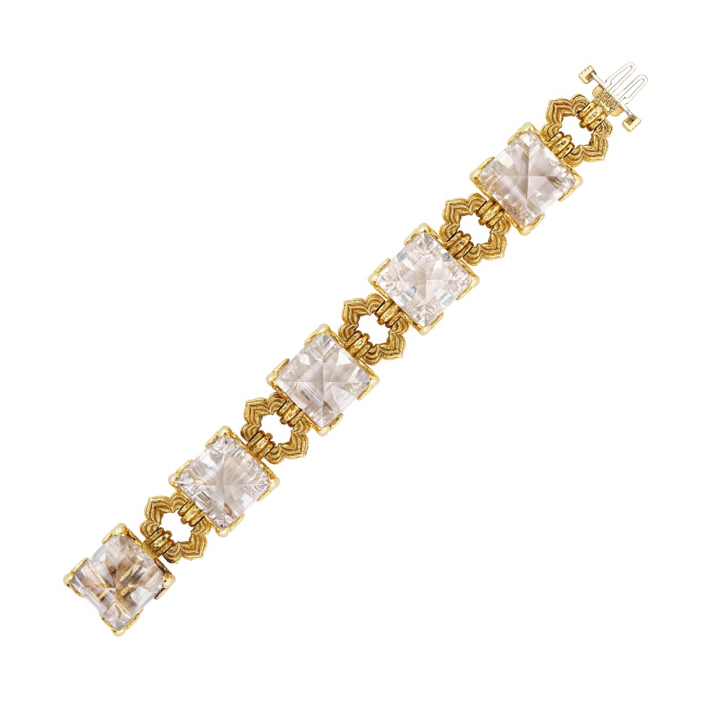 Composed of 5 sugarloaf rock crystals and textured yellow gold links.