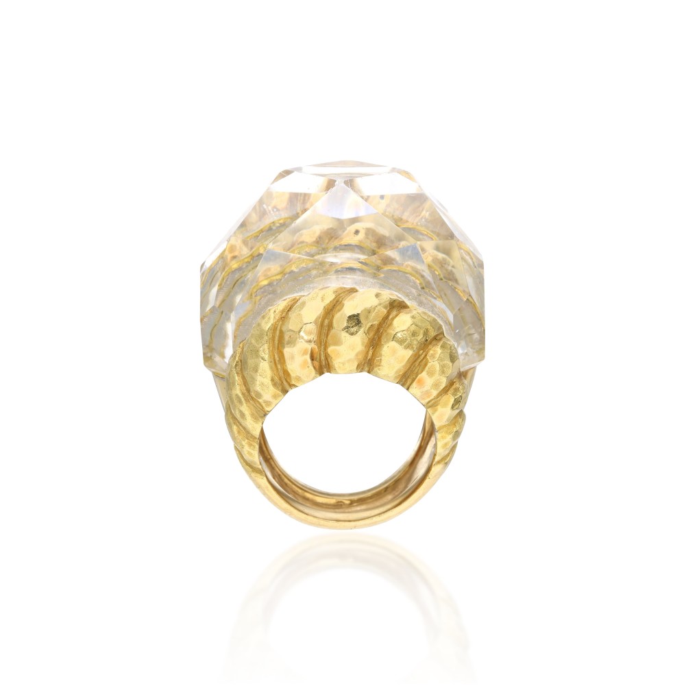 Composed of faceted rock crystal quartz set in a hammered gold shank.
