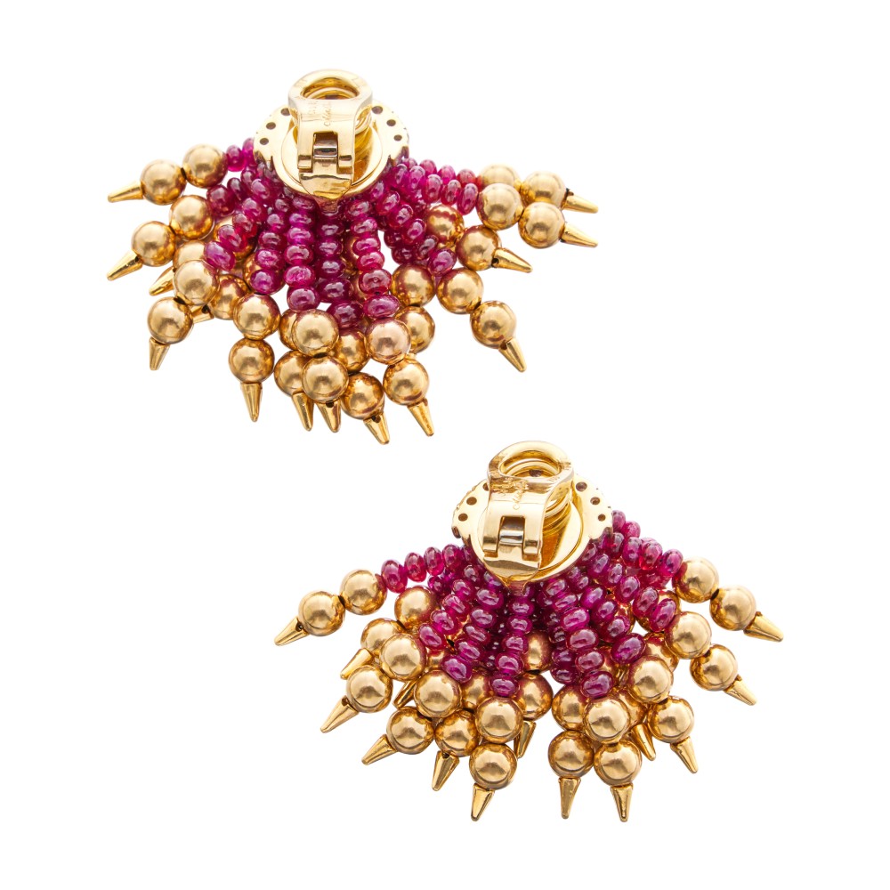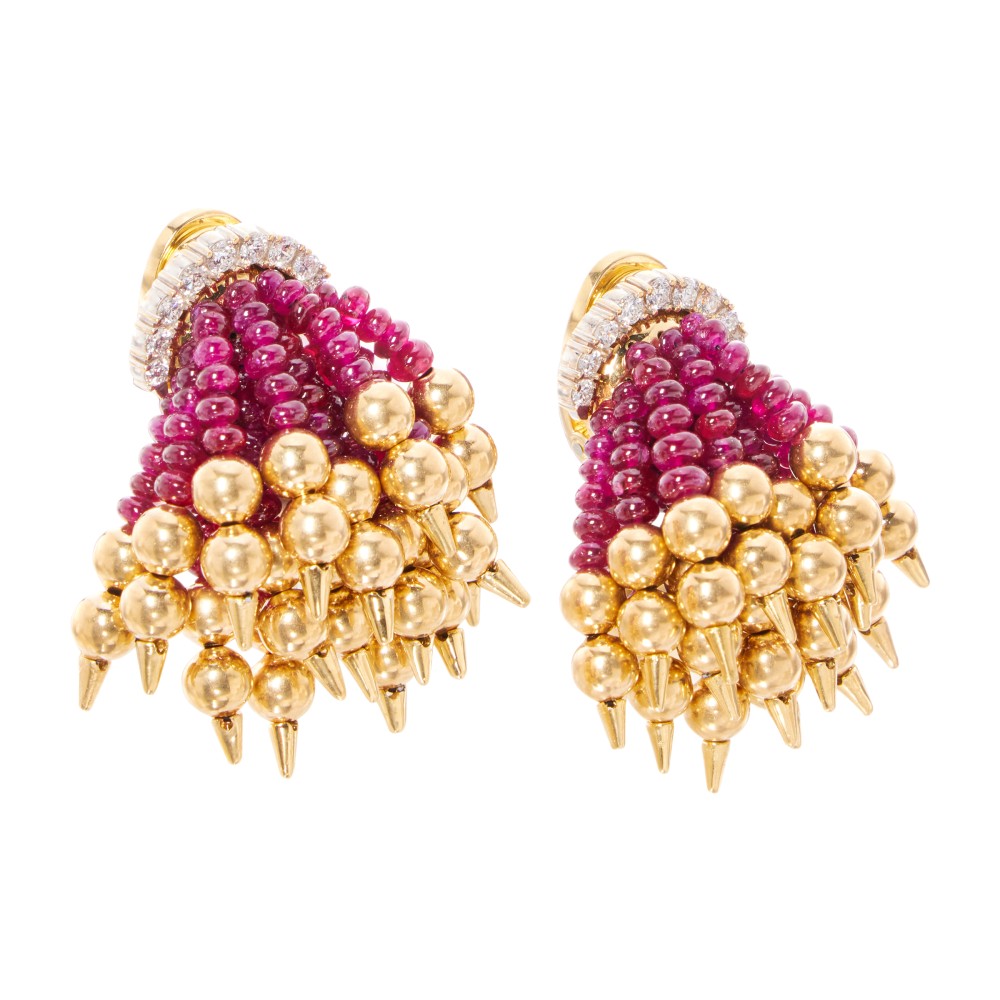 Set with ruby beads, enhanced by diamonds and gold accents.
