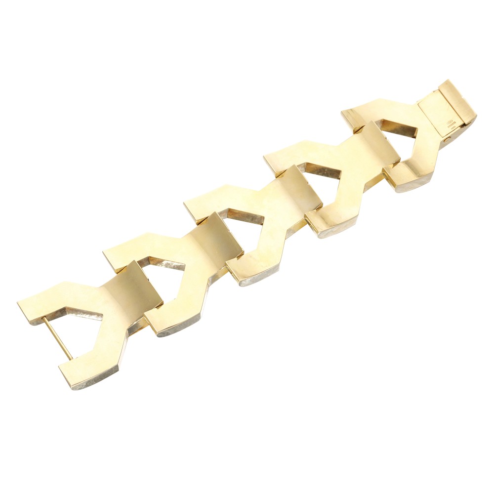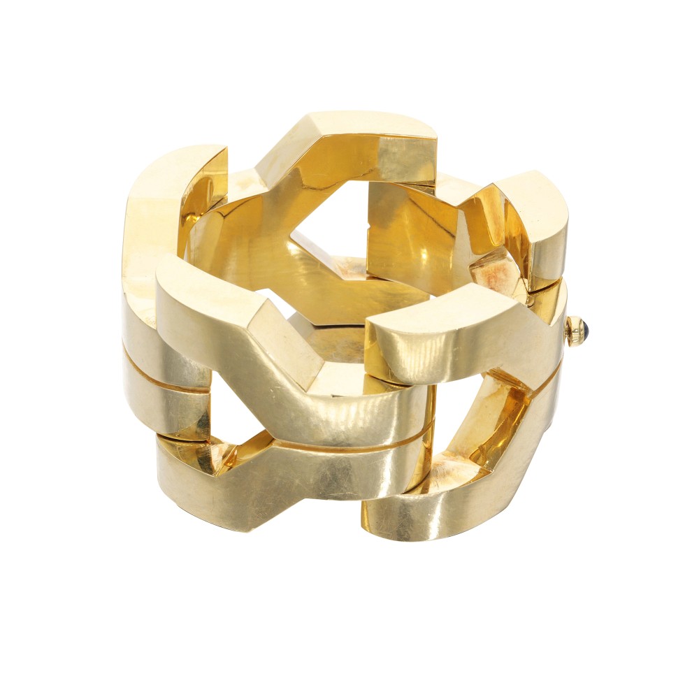 Composed of hinged gold links and completed by a round sapphire cabochon as a clasp.