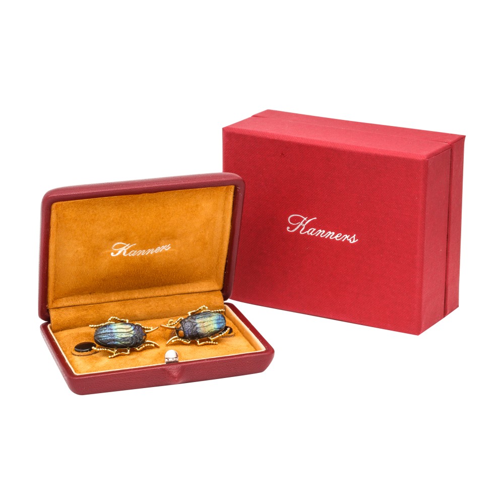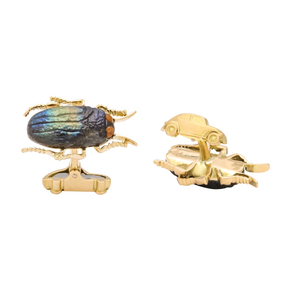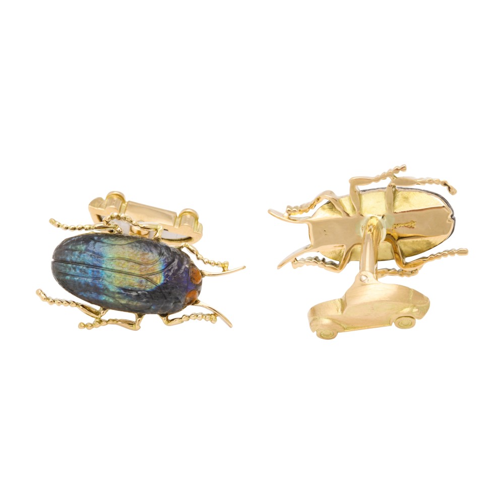 Pair of cufflinks in the form of a Jewel Beetle, set with carved spectrolite, spring back modeled after Volkswagen Beetle.