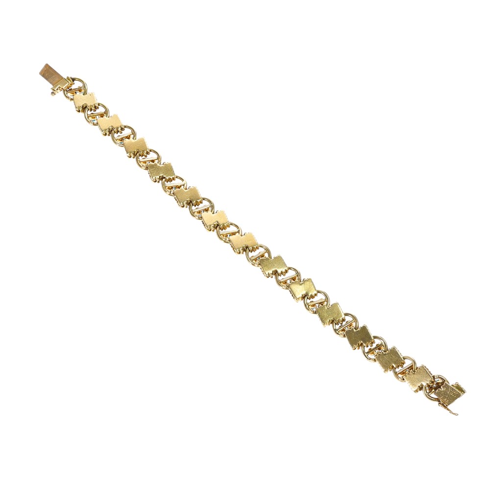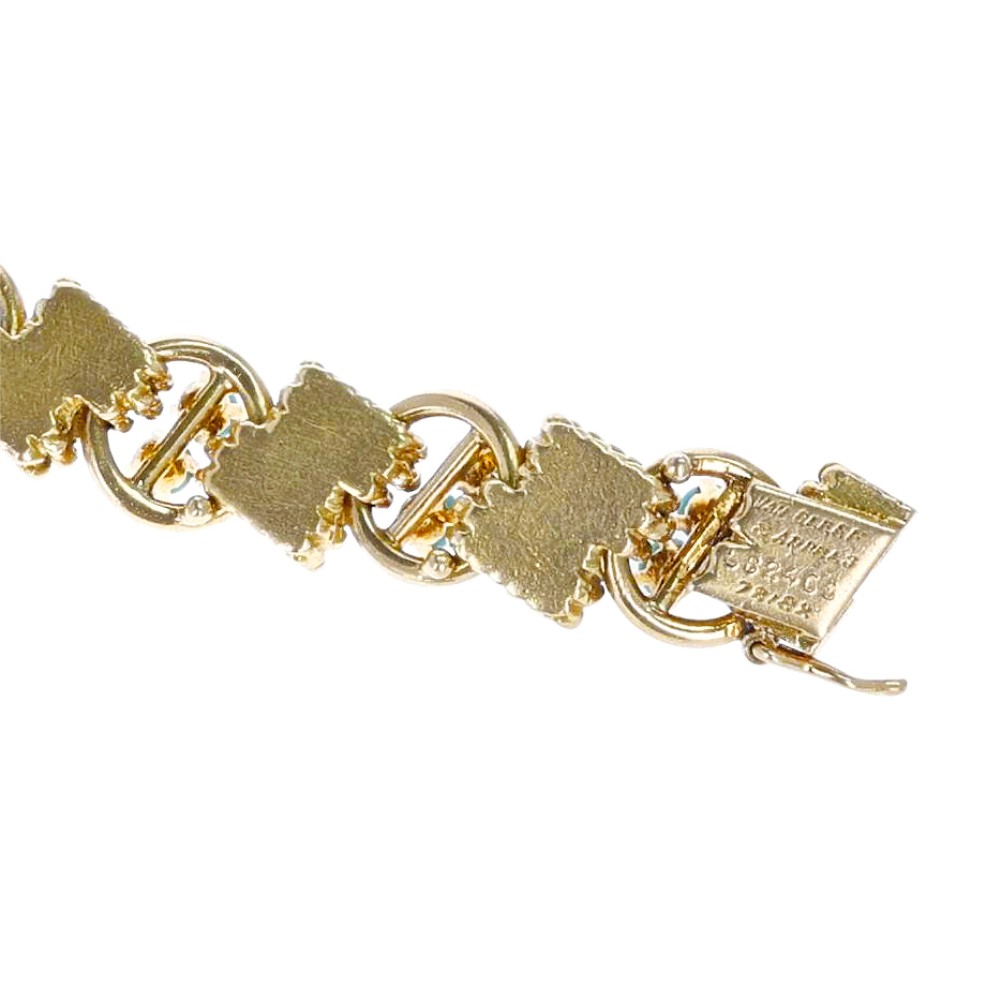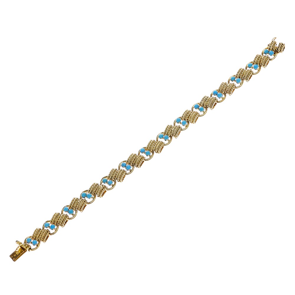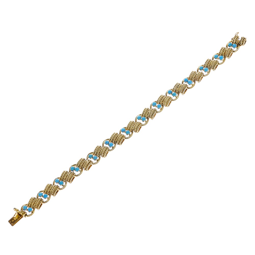 Sculpted gold bracelet, set with round cabochon turquoises.