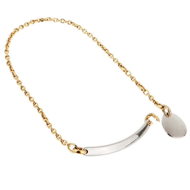 The choker featuring a gold chain connected to an amorphous white gold pendant.