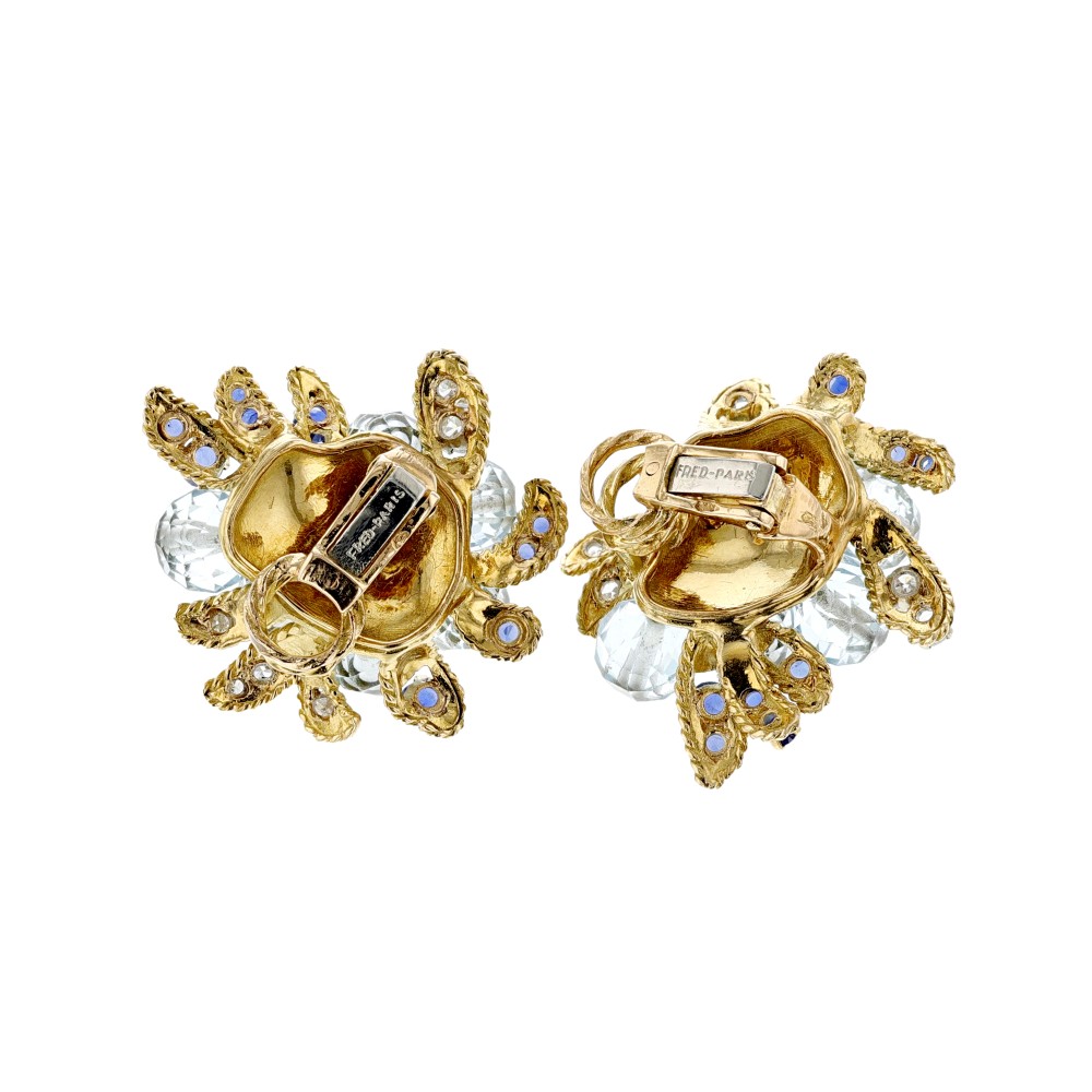 Each centering with facet aquamarine beads, surrounded by leaf motifs, set with sapphire diamonds and round diamonds.
