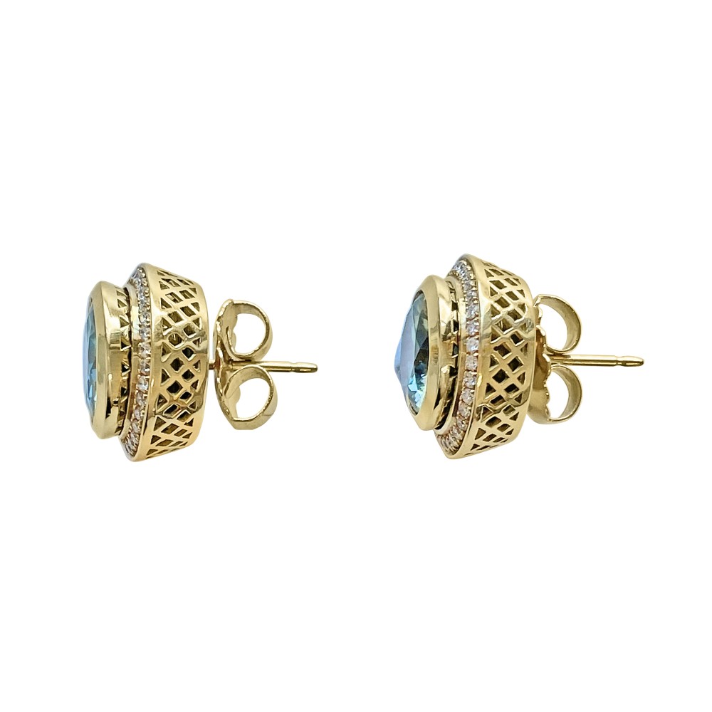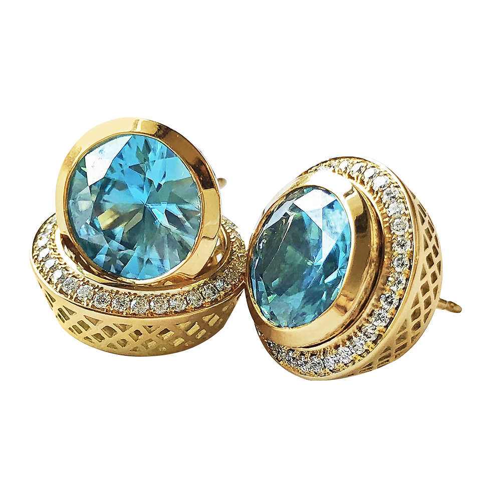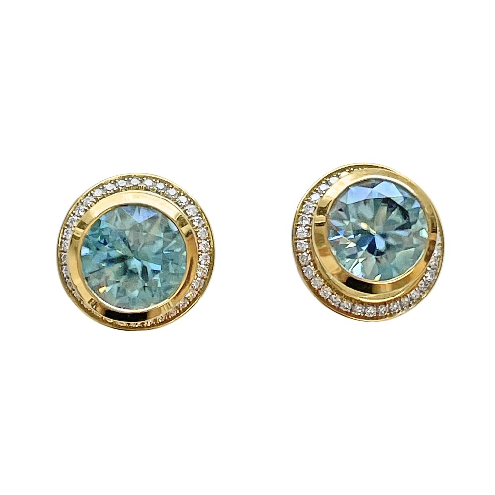Featuring a round bezel-set blue zircon on each, with round diamond halo jackets.