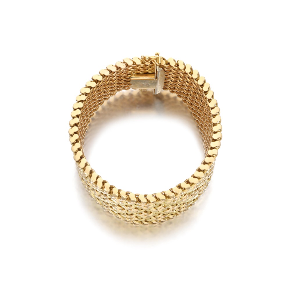 Composed of a flexible, braided link pattern in alternating matte and high-polish gold finishes.