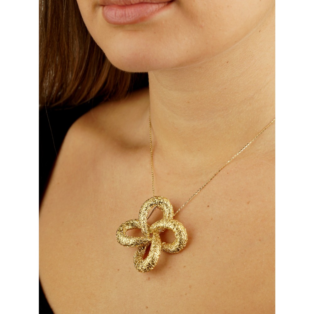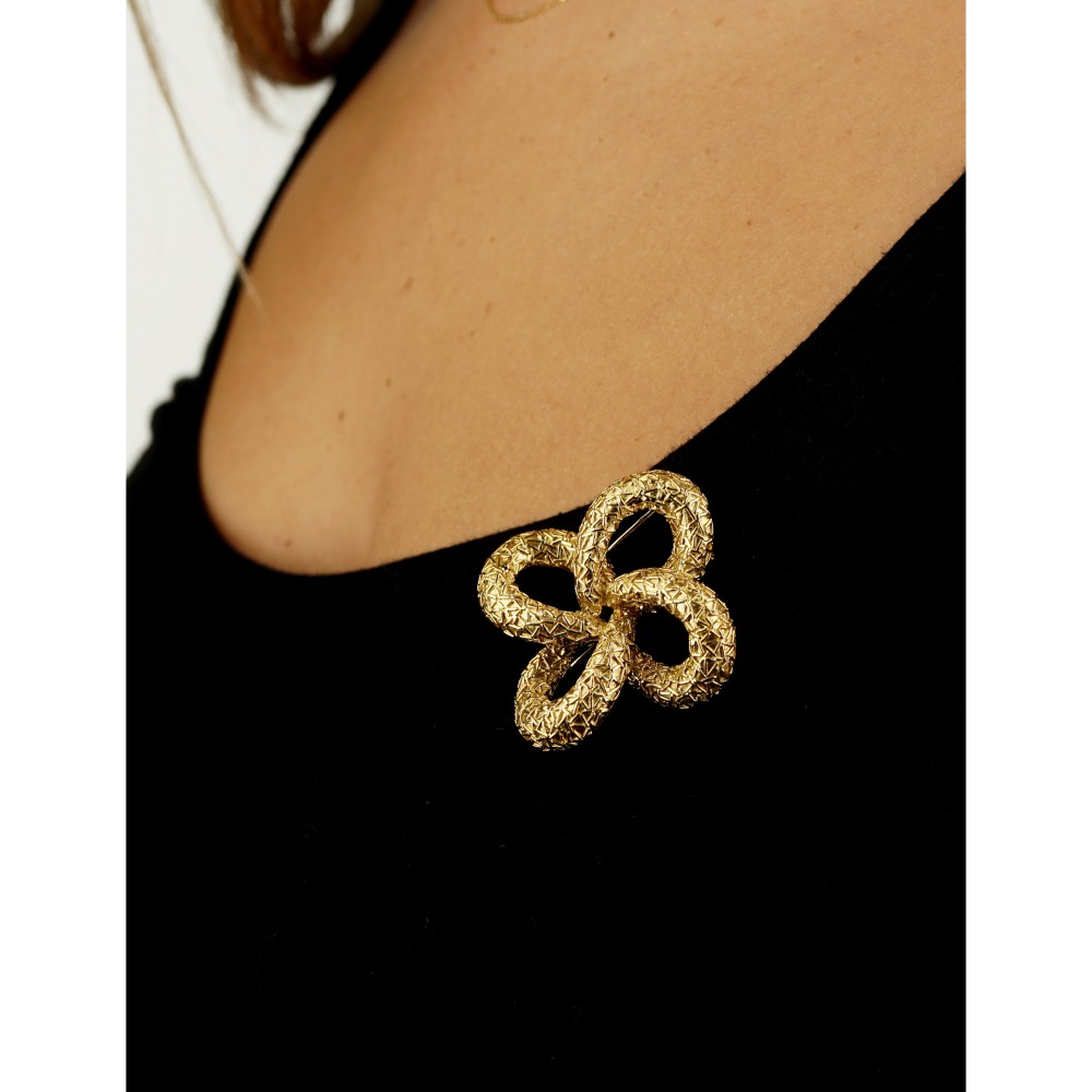 The brooch pendant designed as an interlocking, open four-petaled flower, the gold featuring a textured pattern.