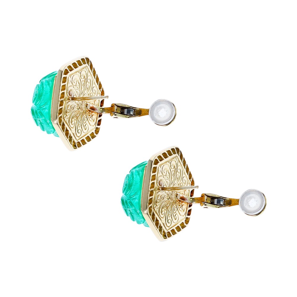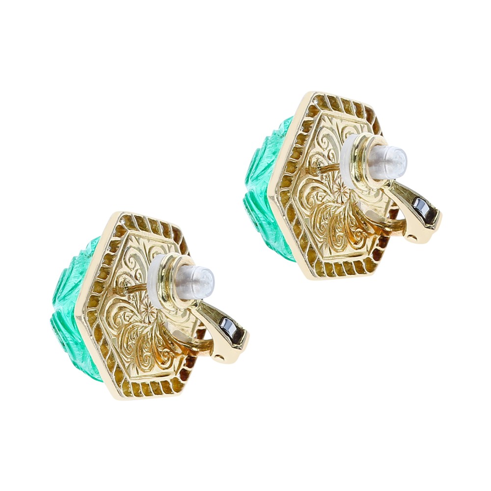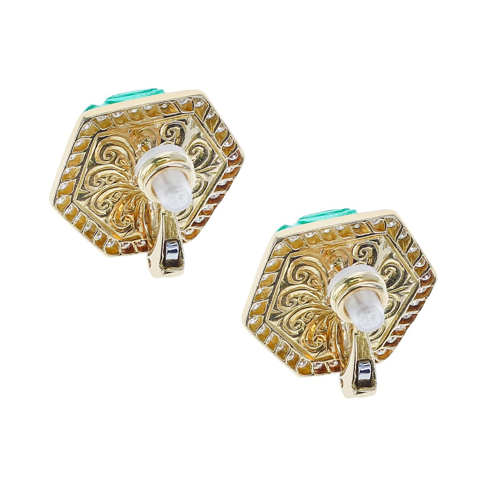 Featuring 2 engraved emeralds, accented by 60 round brilliant cut diamonds.