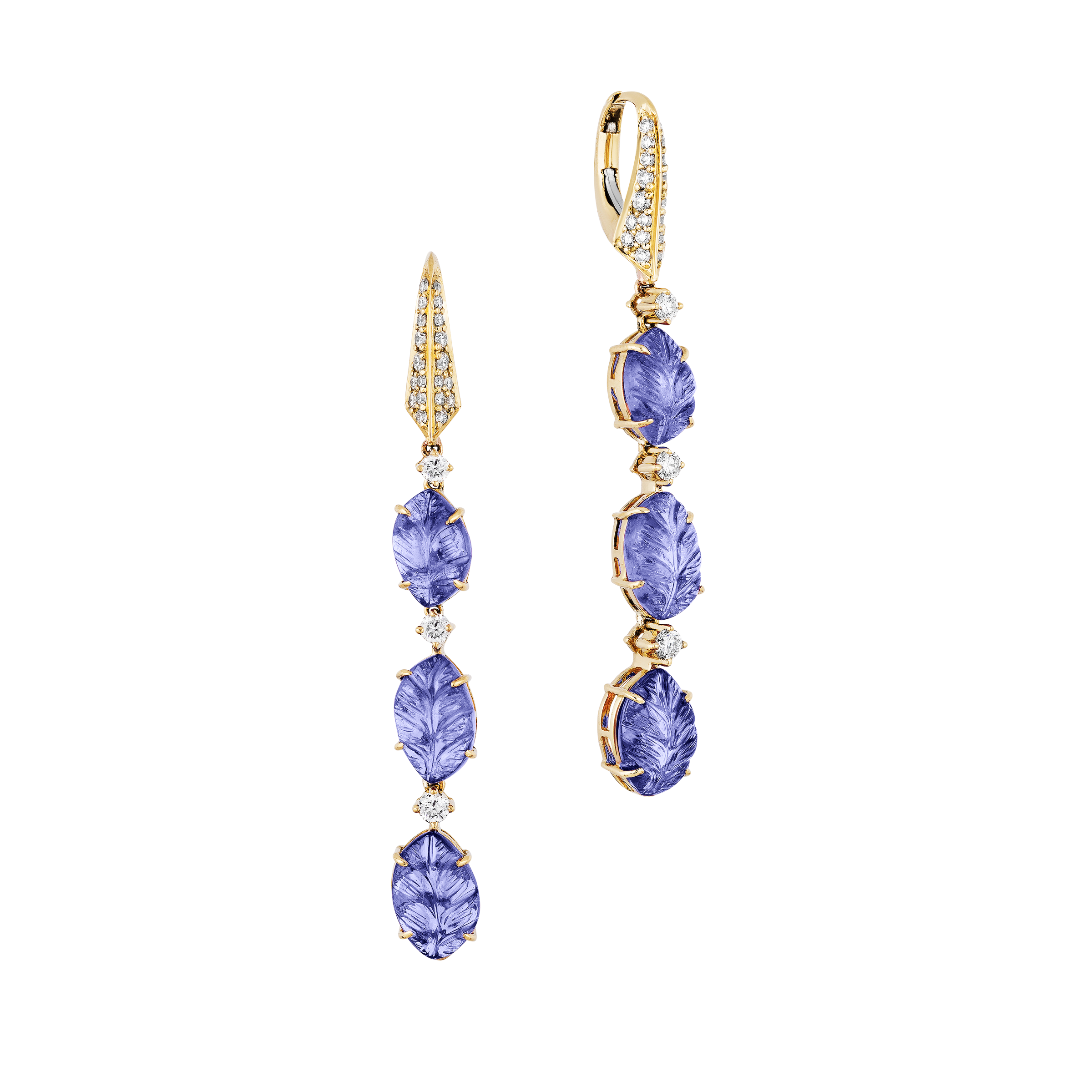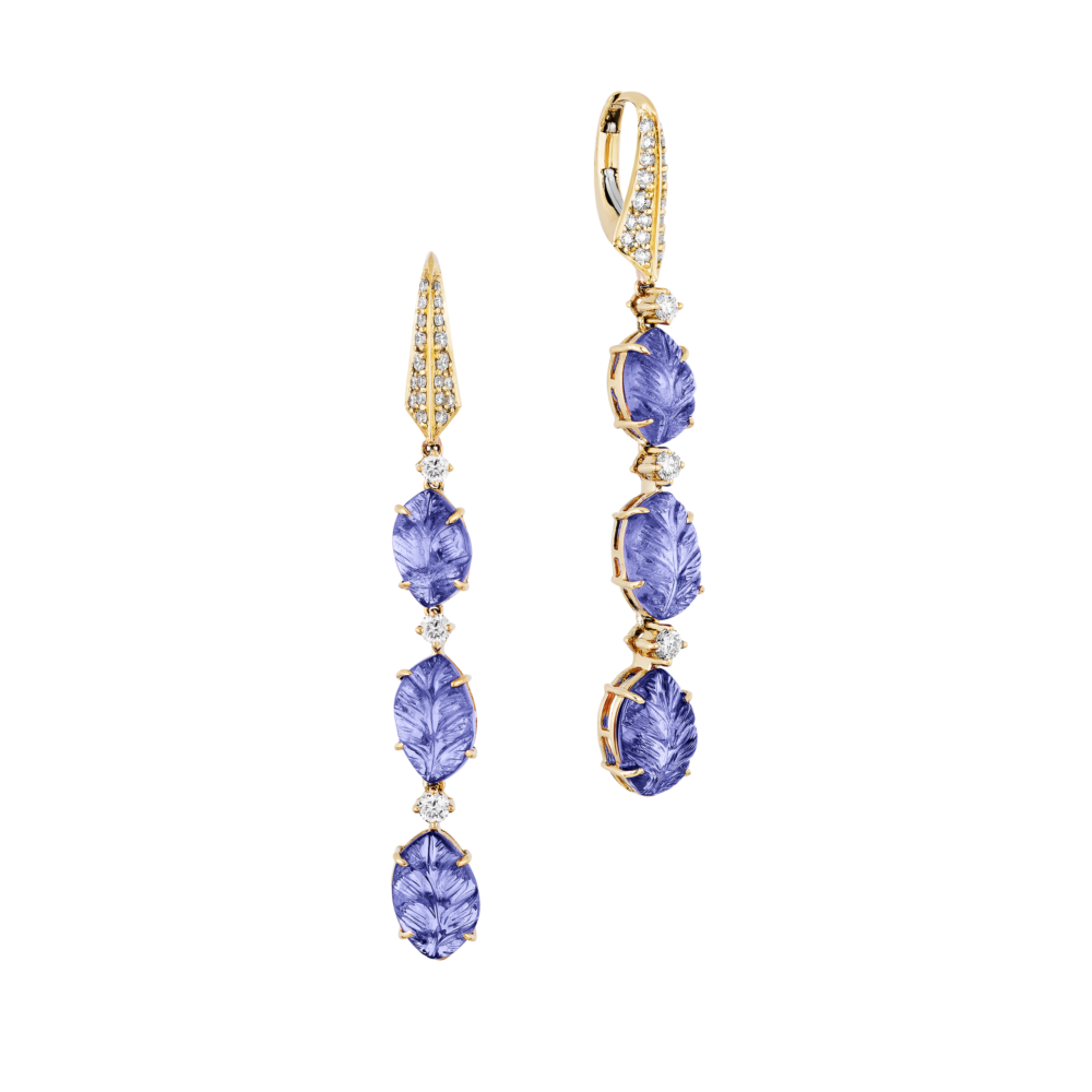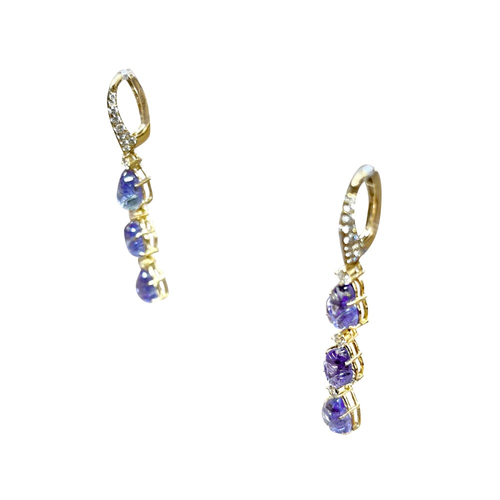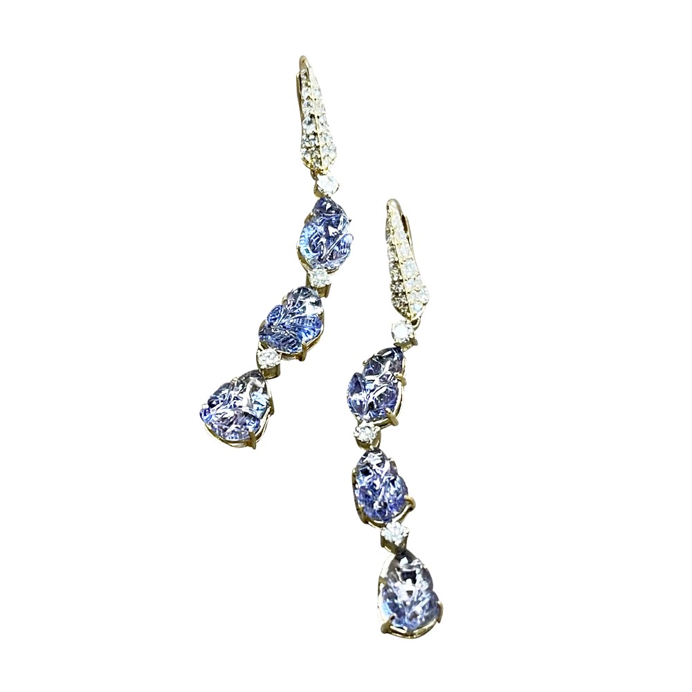 Designed with three carved tanzanite accented with round diamonds.