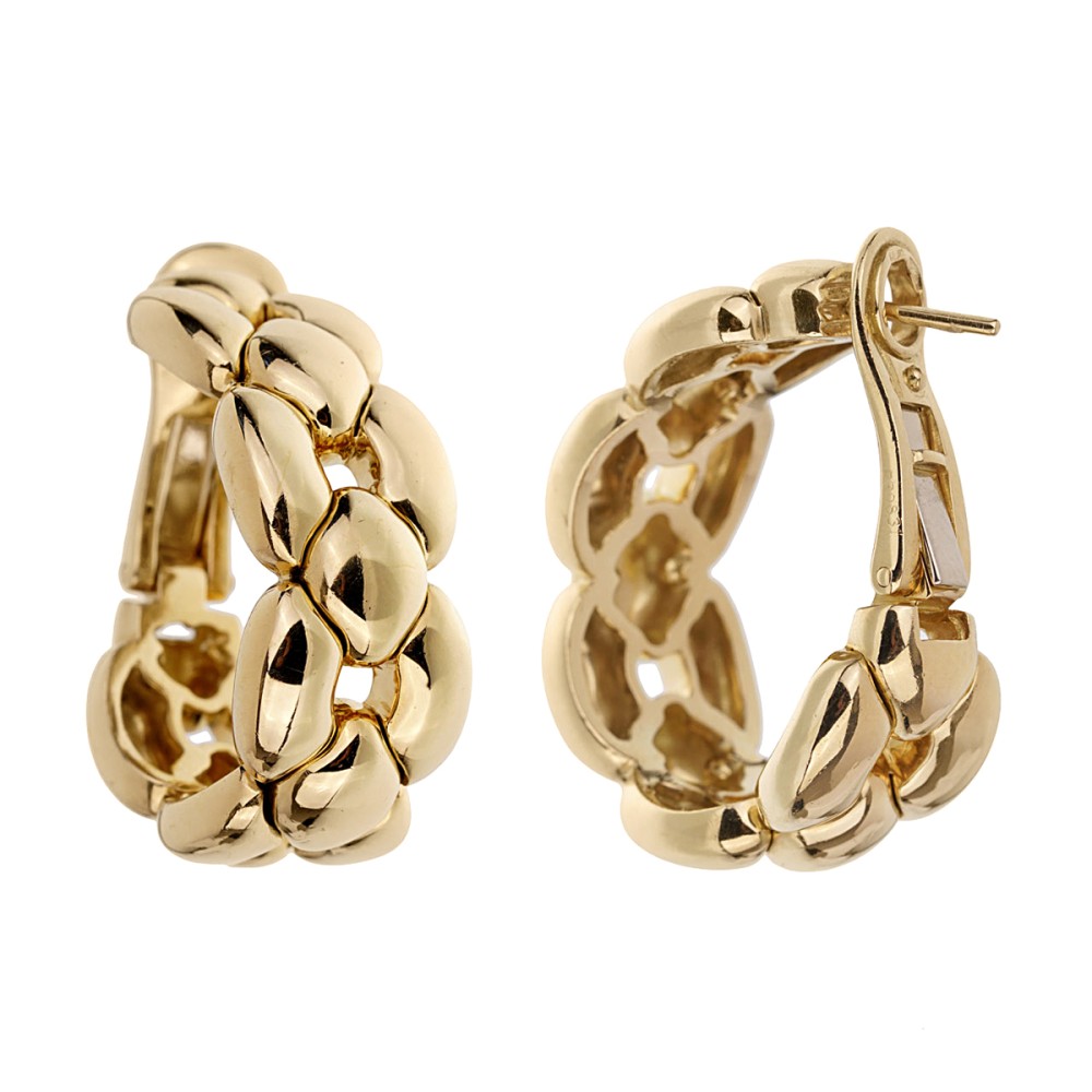 The earrings composed of a series of connected gold links which create a chain-link motif.