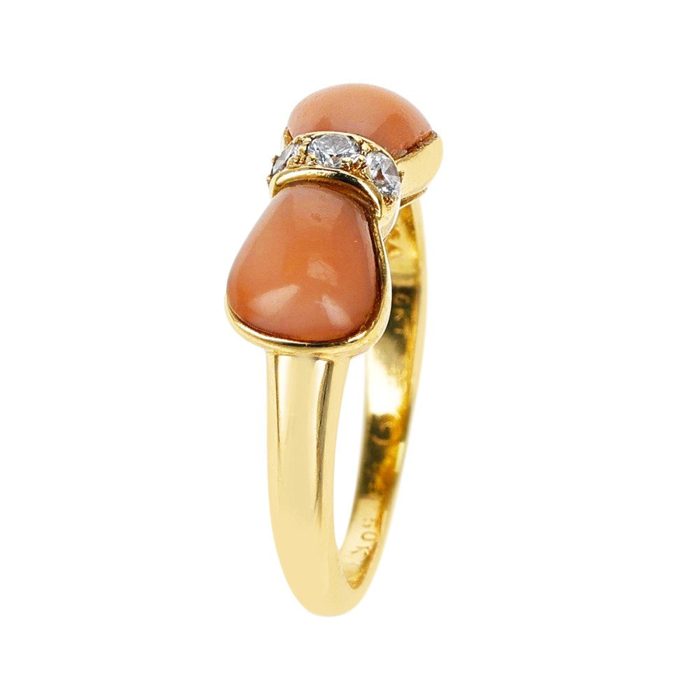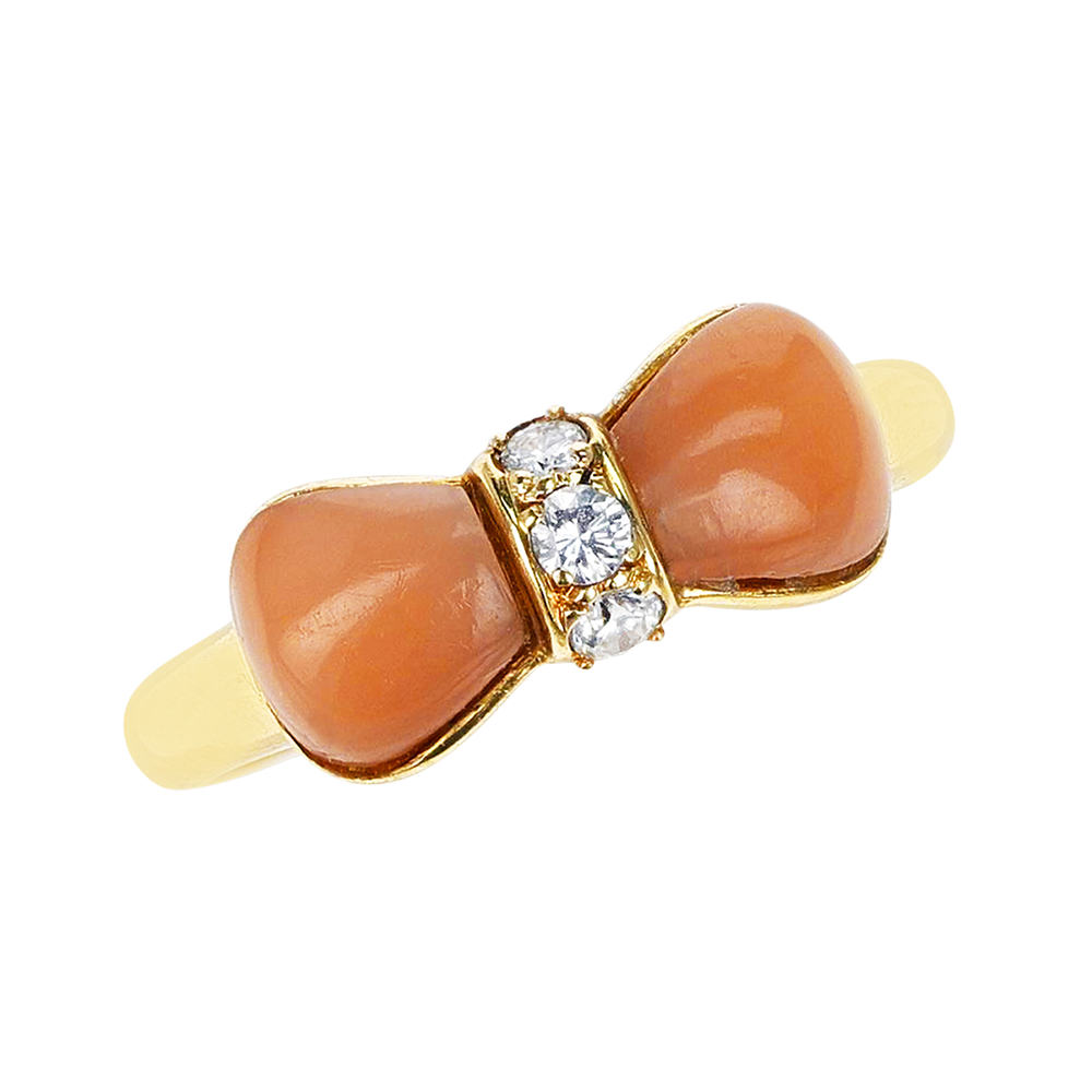 Designed as a bow, set with coral and round brilliant-cut diamonds.