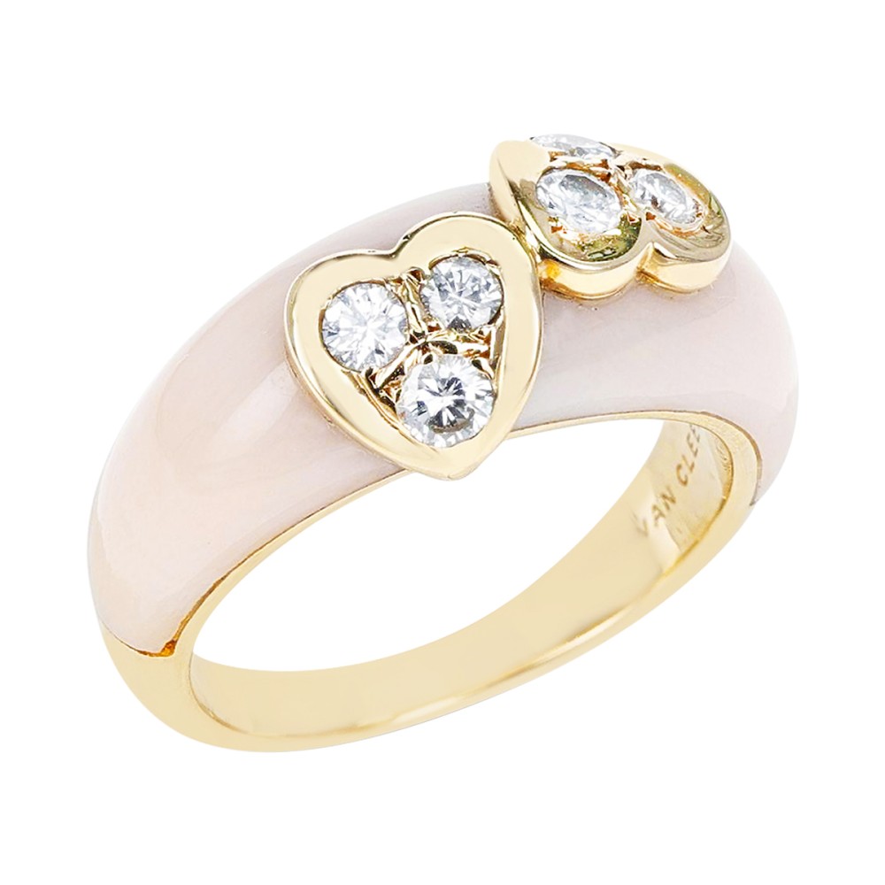 Composed of 2 gold hearts set with diamonds on a coral base.