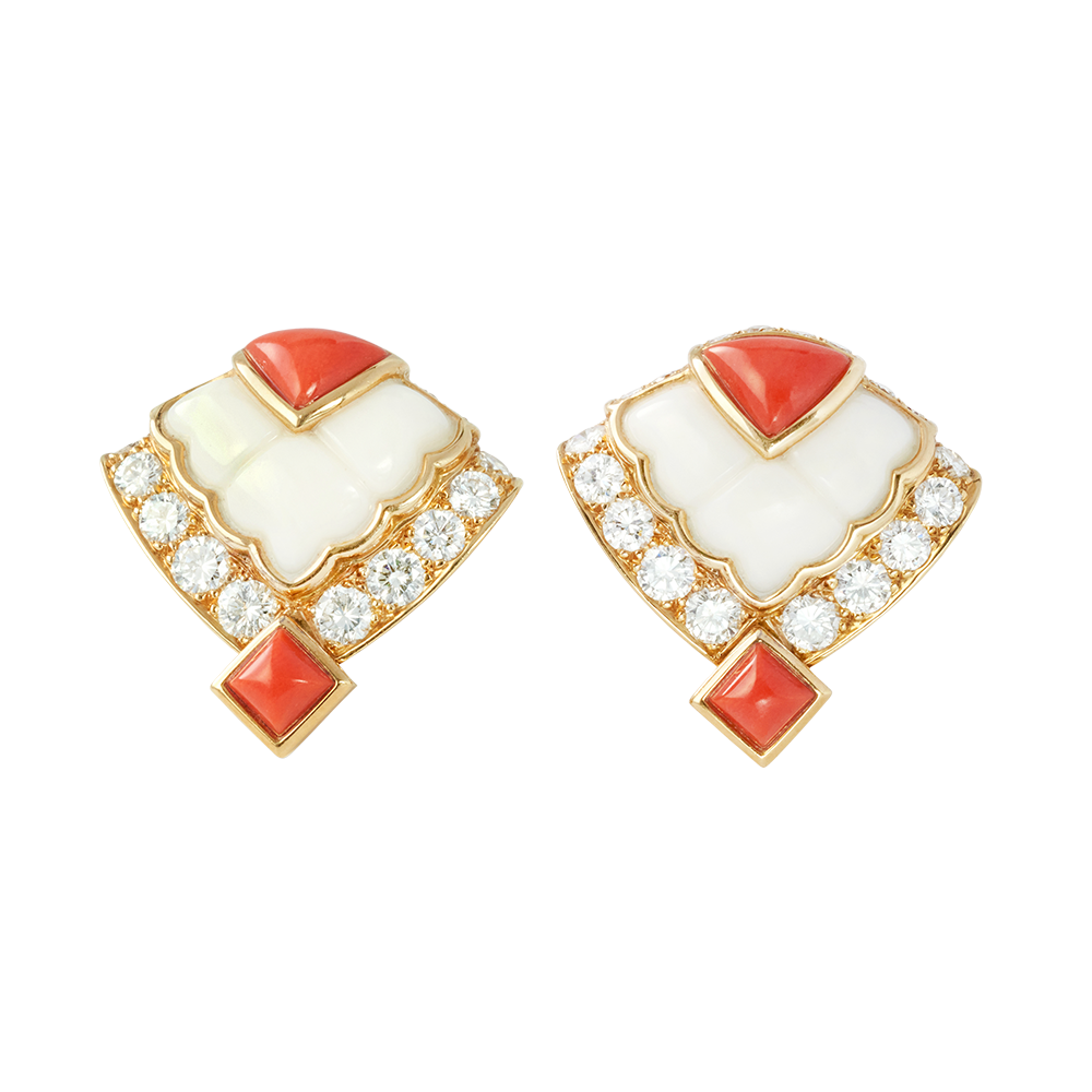 Set with white and red coral, accented by 36 round brilliant cut diamonds.