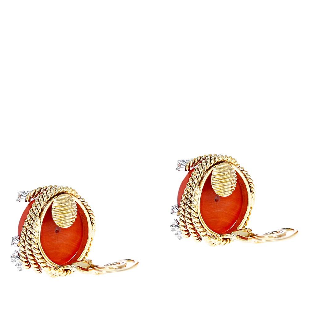Featuring 2 round red coral cabochons, accented by round brilliant-cut diamonds.
