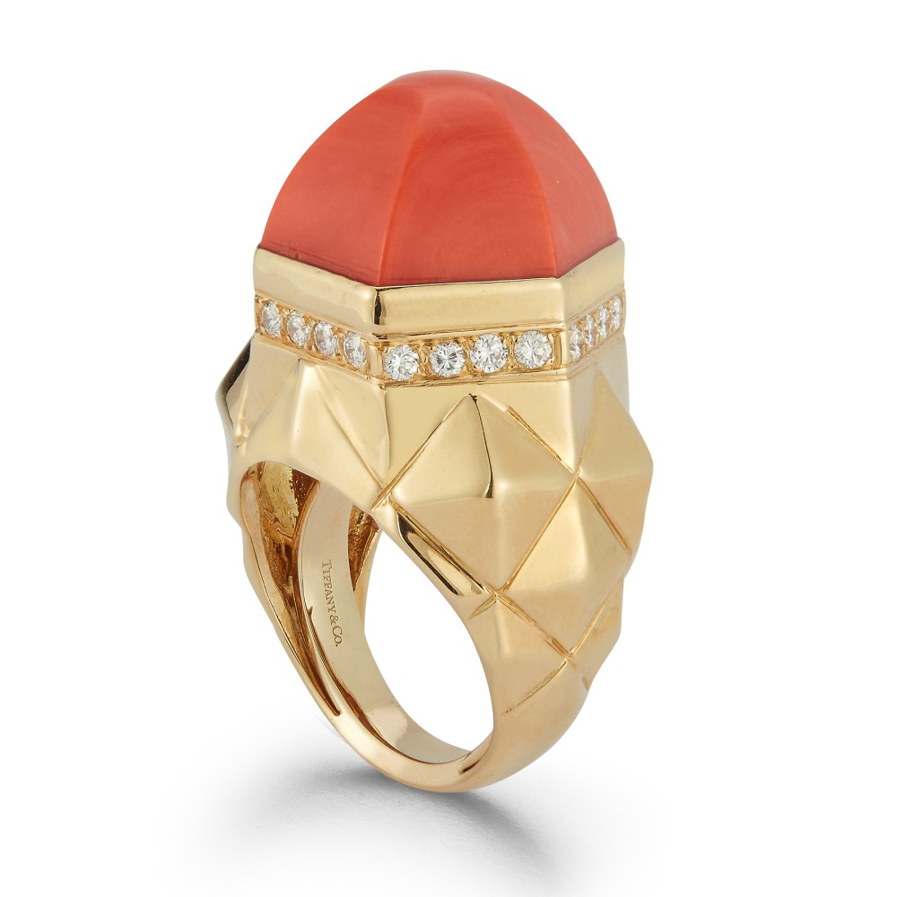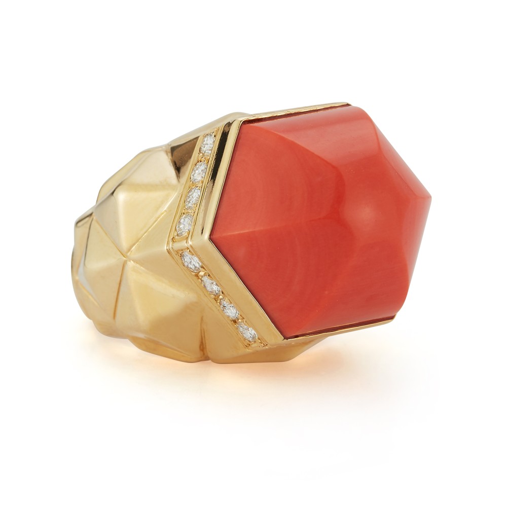 Composed of a faceted cabochon-shaped coral, accented by round diamonds and geometric pattern gold.