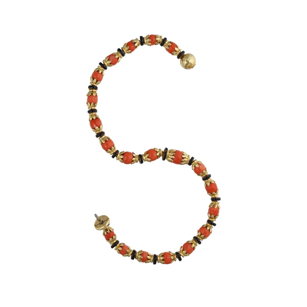 Composed of faceted coral beads interspaced by gold beads accented by opaque black enamel.