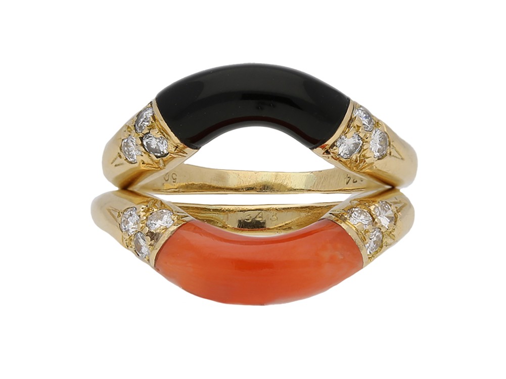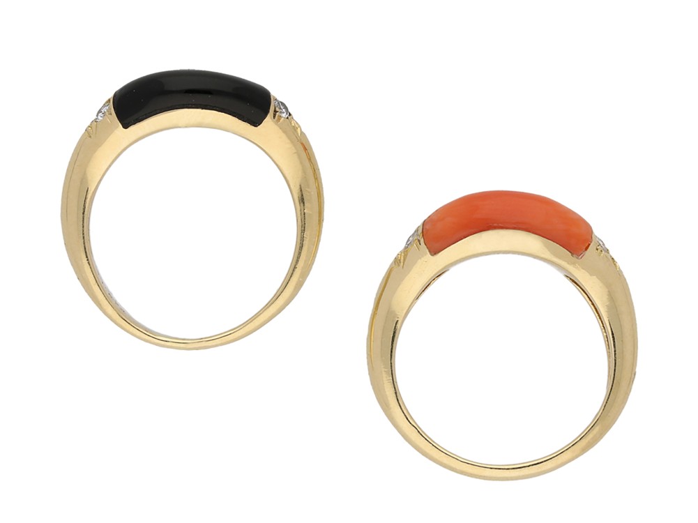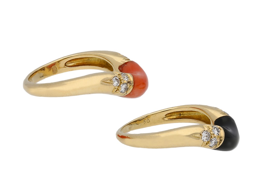 Cartier coral and onyx stack rings of yellow gold, each set to the shoulders with 12 round old-cut diamonds, one set with coral and the other set with onyx.