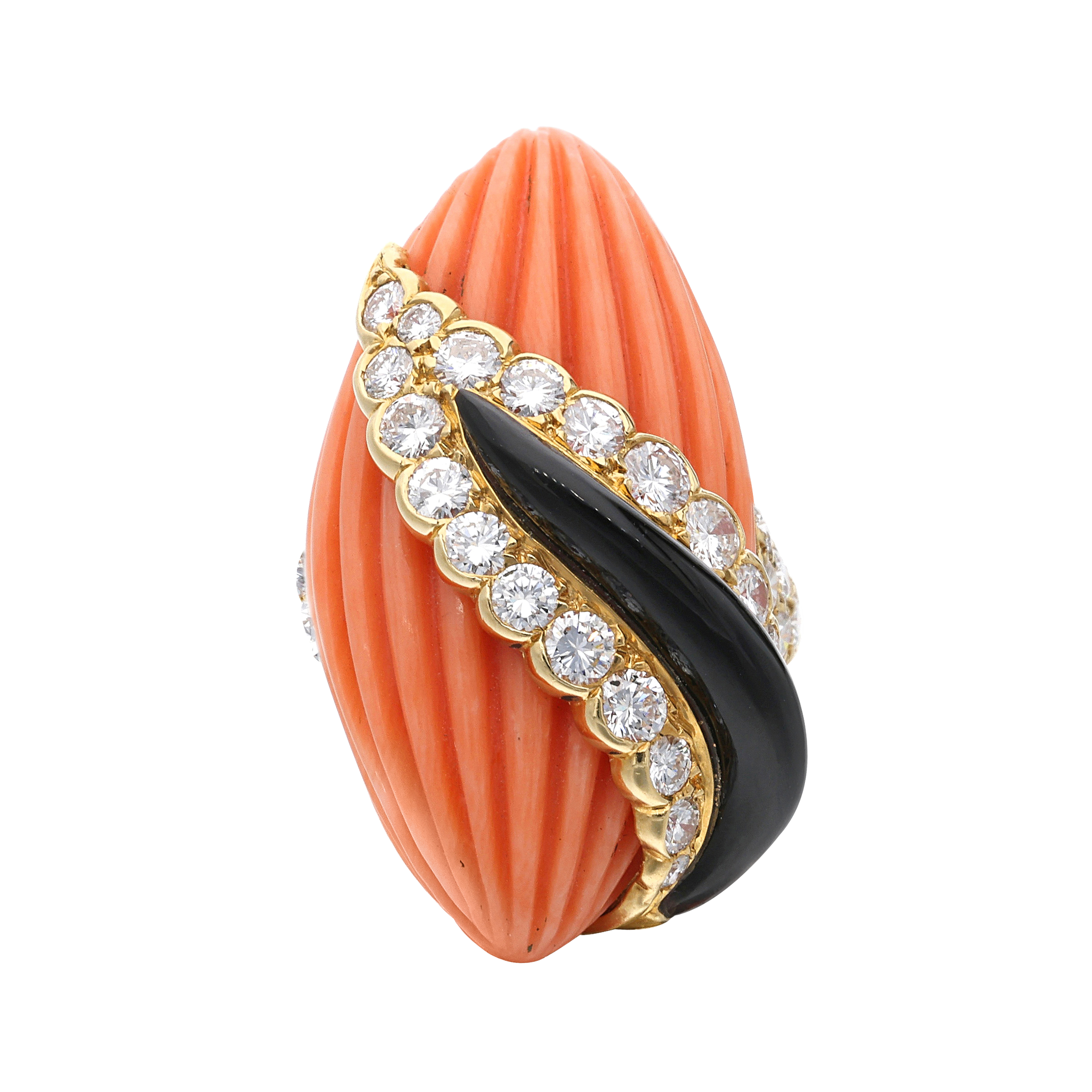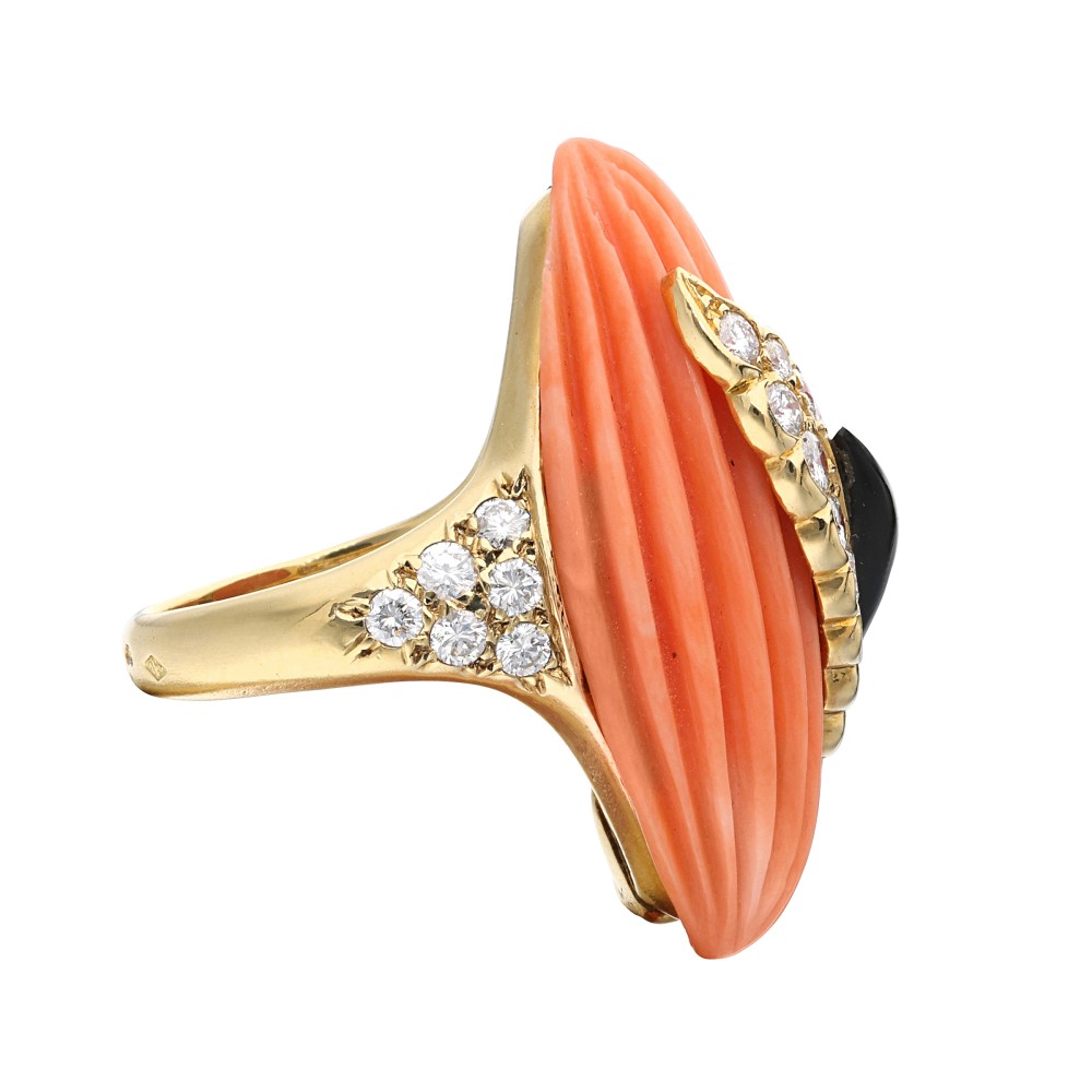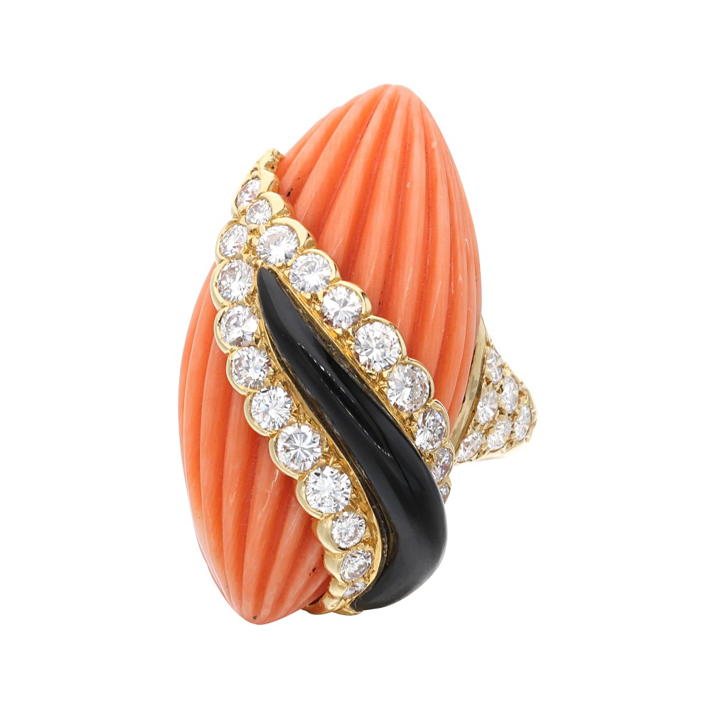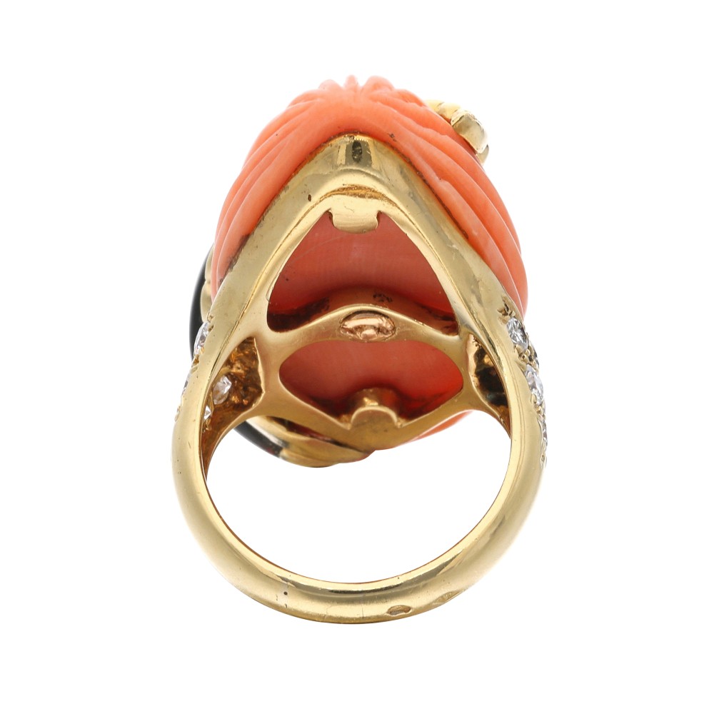 Composed of carved coral, accented by onyx and round diamonds.