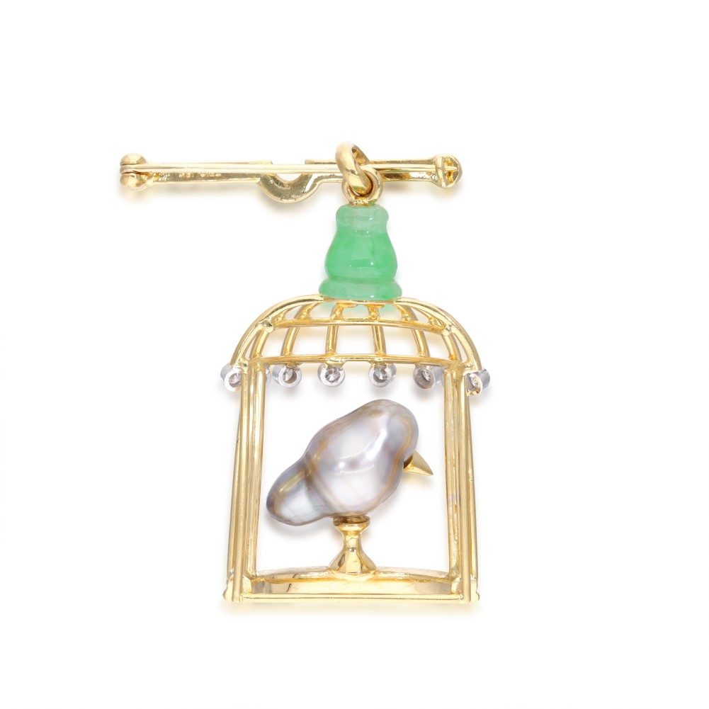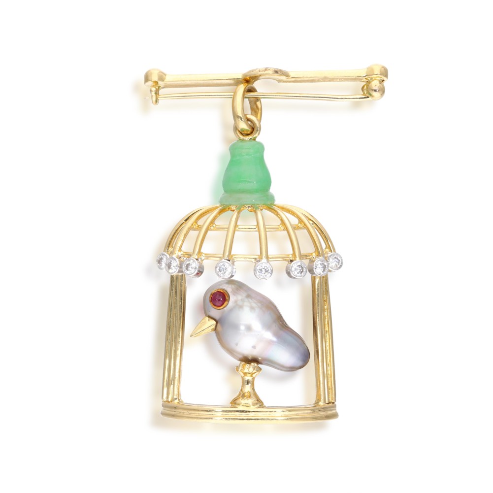 Designed as a cage with a bird standing, composed of a cultured baroque pearl as bird body, bezel set ruby as eye, carved jade as cage cap, accented by round diamonds.