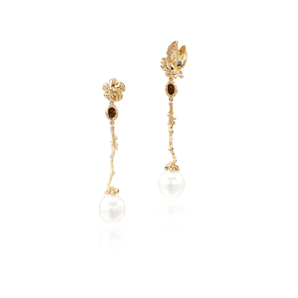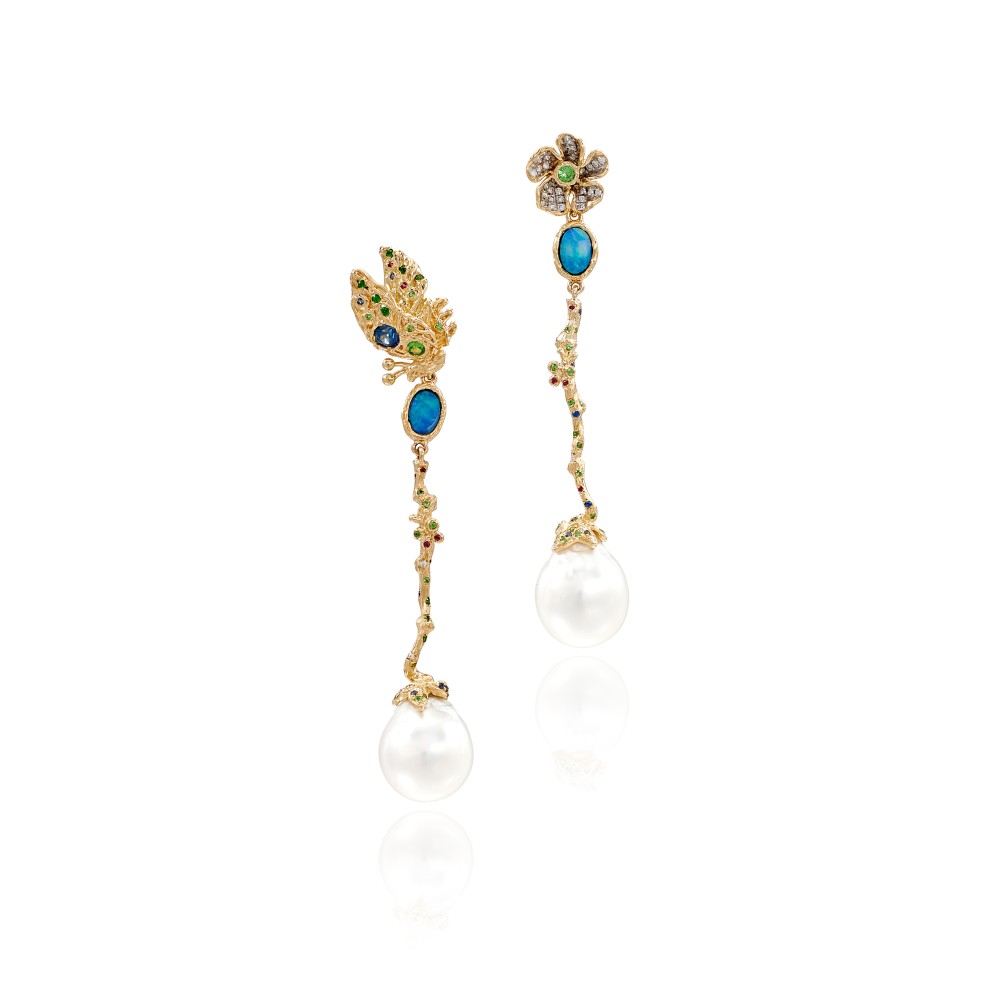 Featuring butterfly and flower motifs, set with two opals and two baroque pearls, accented by 95 emeralds, sapphires, green sapphires, rubies and diamonds.