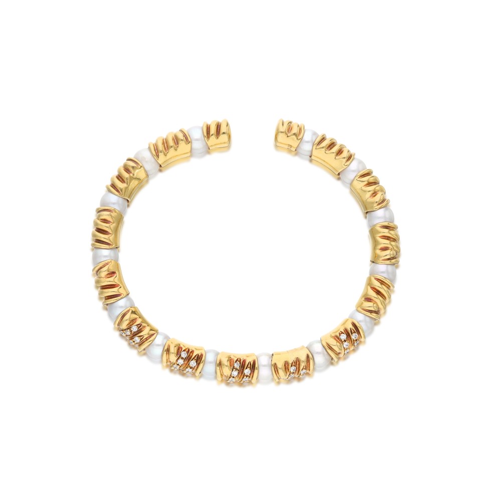 Set with 14 cultured pearls, accented by 50 round diamonds.