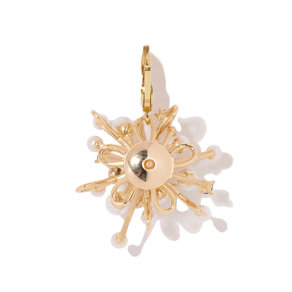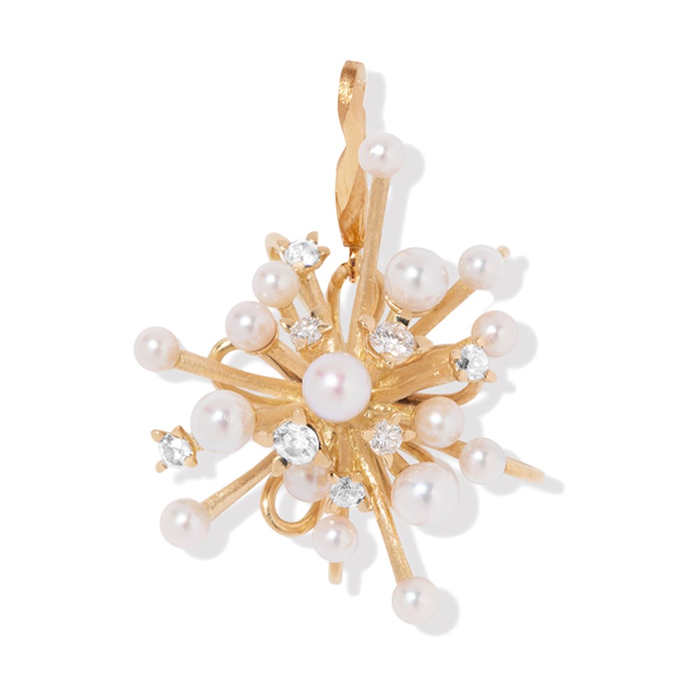 Designed as fireworks sparks, composed of numerous cultured pearls and round diamonds.