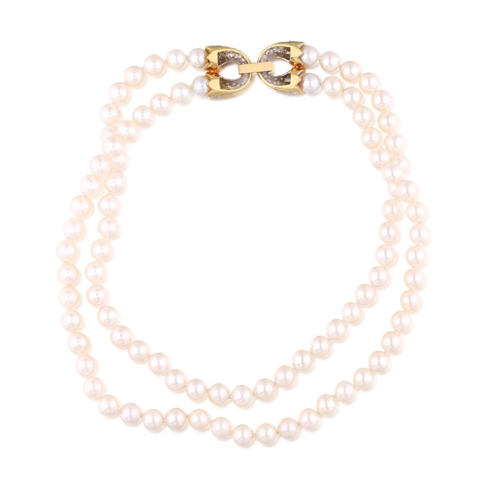 Composed of cultured pearls on a knotted strand, completed by a gold clasp accented by round brilliant-cut diamonds.