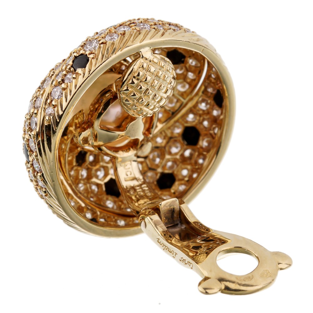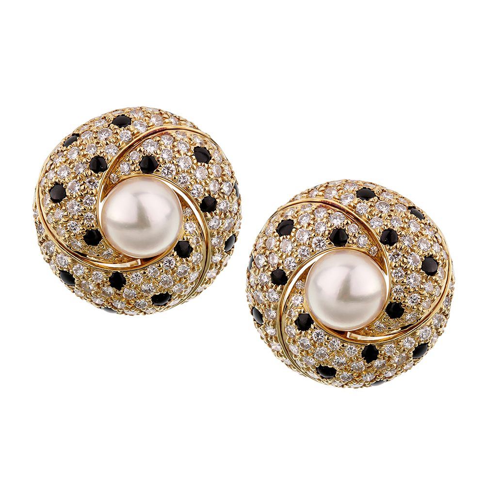 The earclips designed as overlapping segments of gold pav? set with diamonds and onyx, the motif centering cultured pearls.