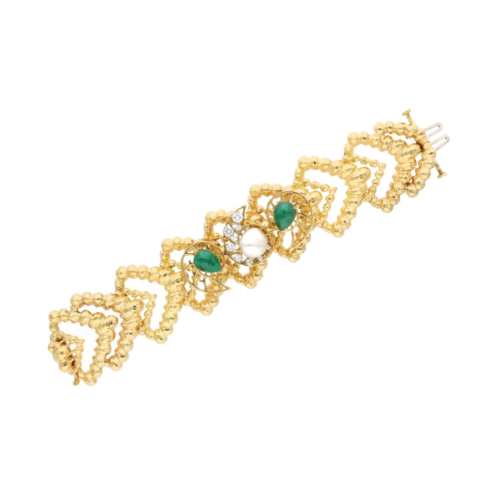 Centering a cultured pearl, accented by 2 pear-shaped emerald cabochons, accented by round brilliant cut diamonds.