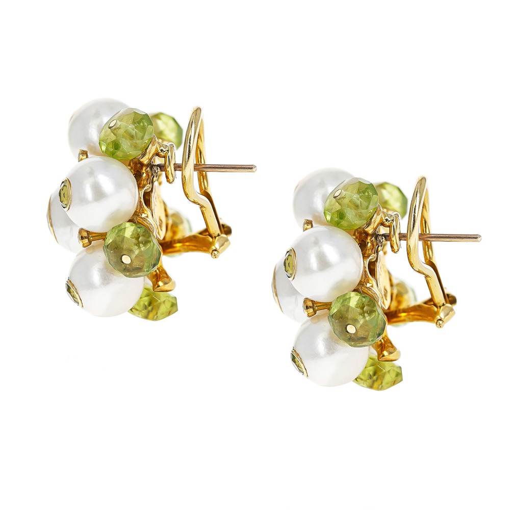 Centering a bezel set round peridot in a cultured pearl, surrounded by 5 additional cultured pearls with bezel set peridots, alternating with peridot beads, accented by round diamonds.