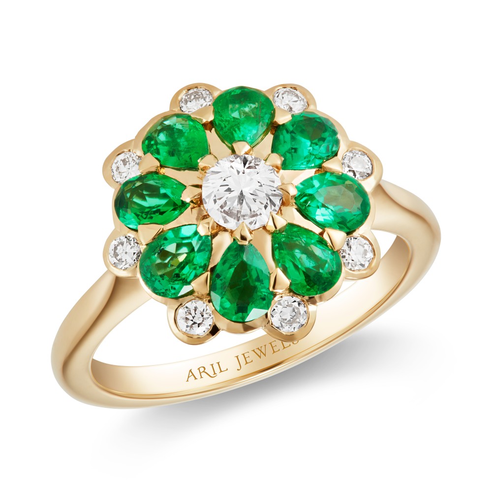 Inspired by Elizabethan England and floral motifs, composed of 8 old-cut diamonds in rub-over setting, 8 emeralds and 1 old-cut diamond claw-set to the center.