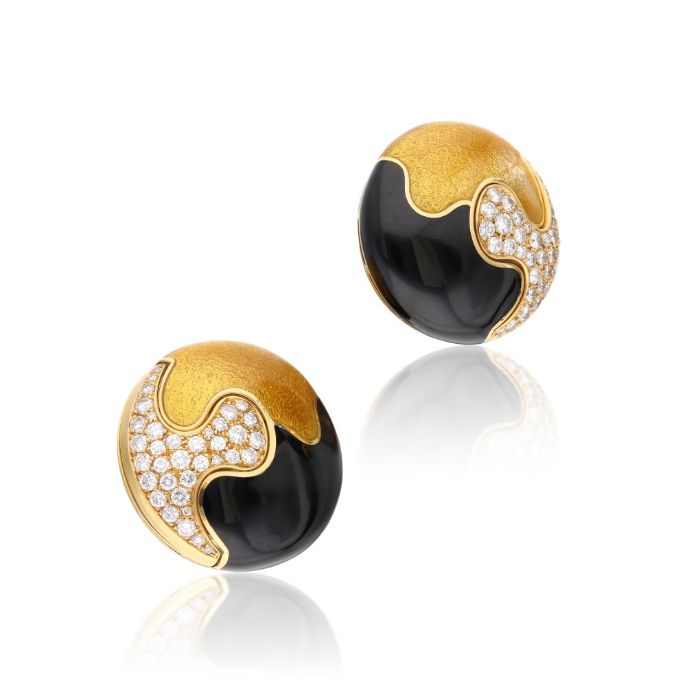 Composed of round brilliant-cut diamonds, accented by transparent yellow and opaque black enamel.