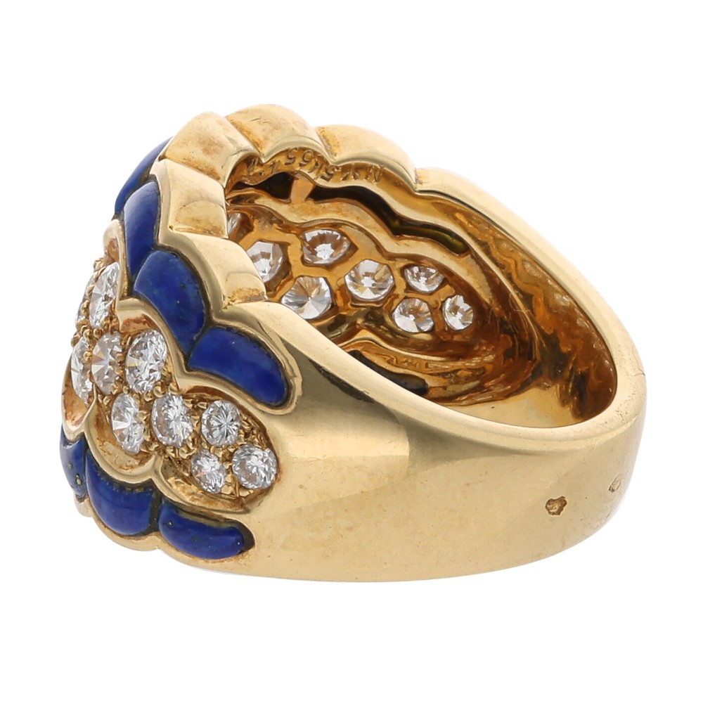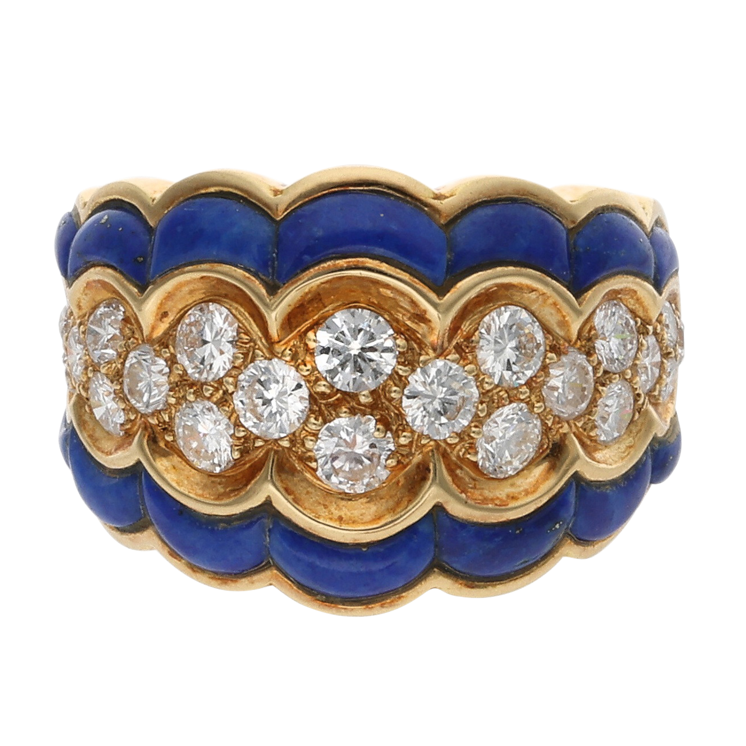 Of scalloped design, composed of lapis lazuli and round brilliant cut diamonds.