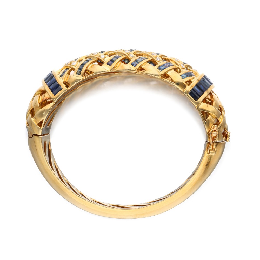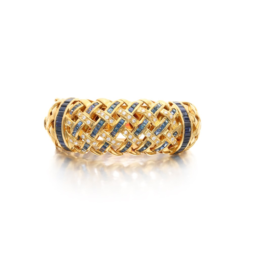 Composed of round brilliant-cut diamonds, accented by baguette and square-shaped sapphires.