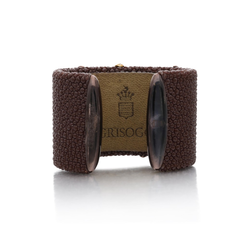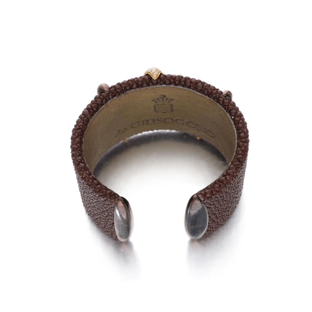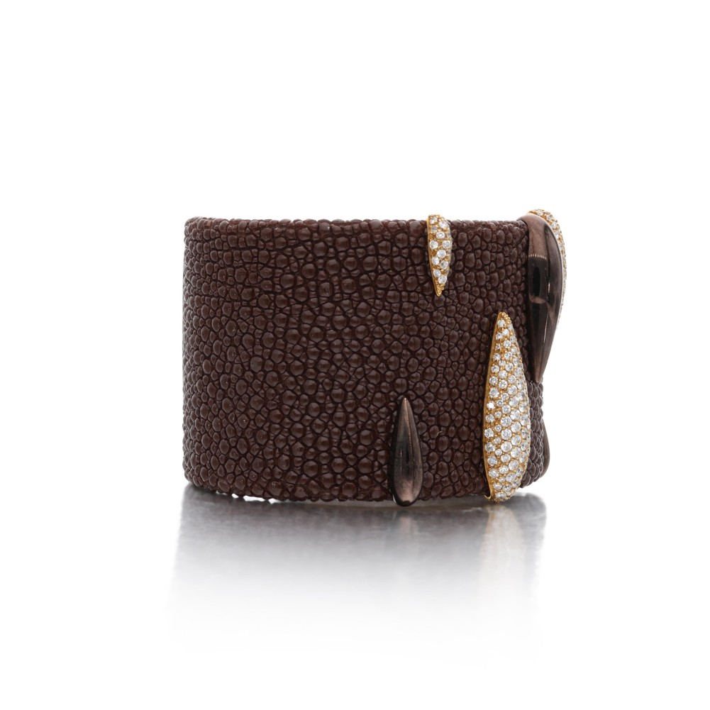 Of the Galuchat Collection, composed of round brilliant-cut diamonds on a brown shagreen cuff.
