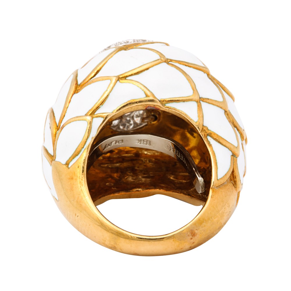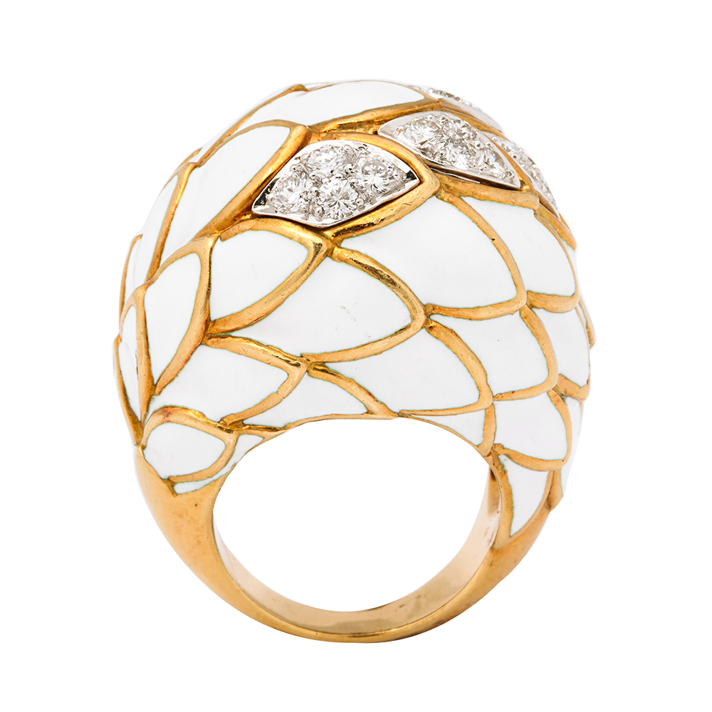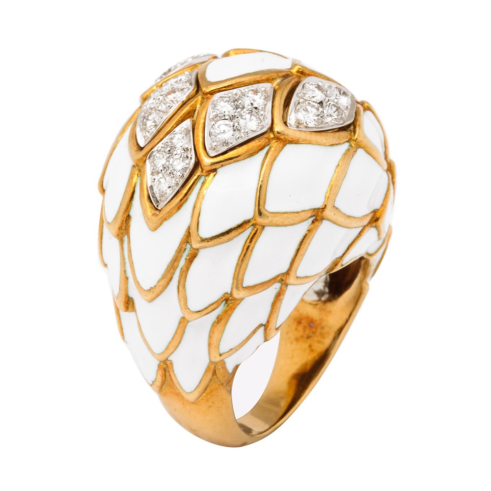 Bomb? ring in a scale design, set with diamonds and white enamel