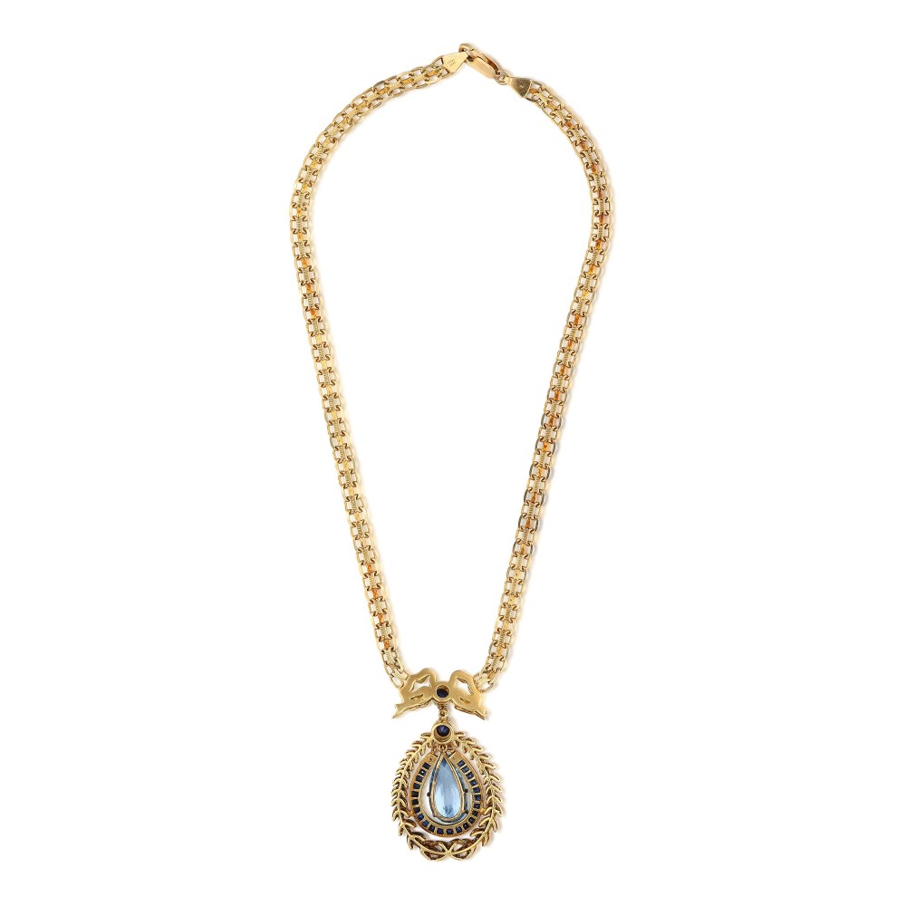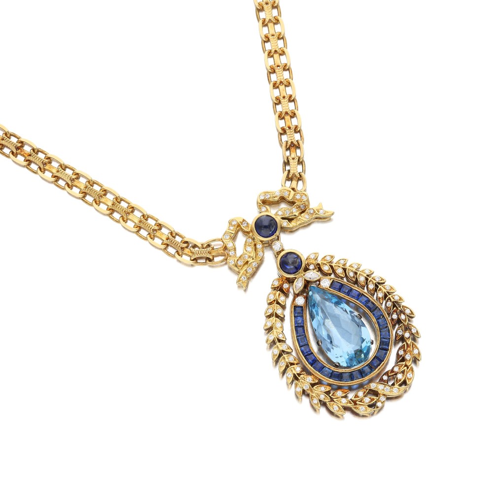 Centering a pear-shaped aquamarine, accented by round cabochons and calibr?-cut sapphires and enhanced by round brilliant-cut diamonds.