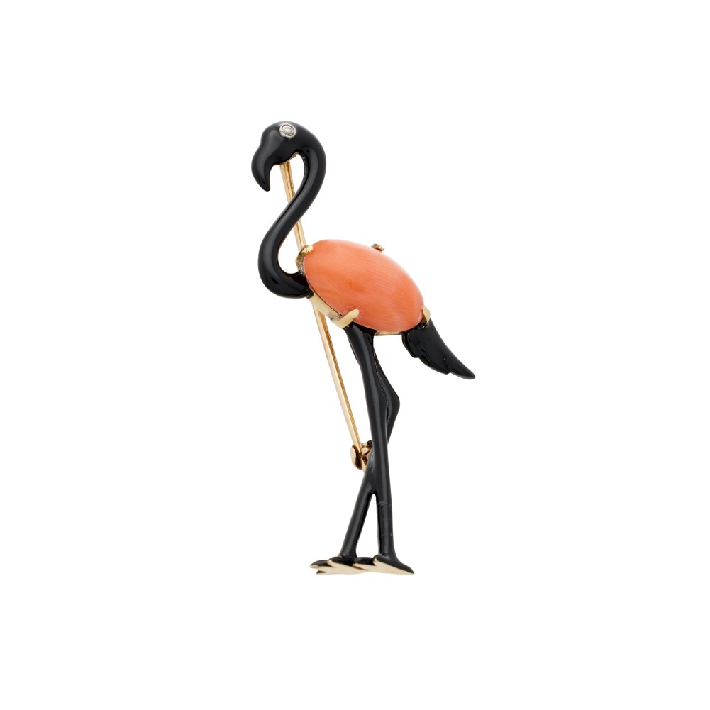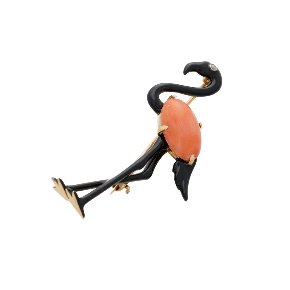 Composed of a coral cabochon and a European-cut diamond, accented by black enamel.