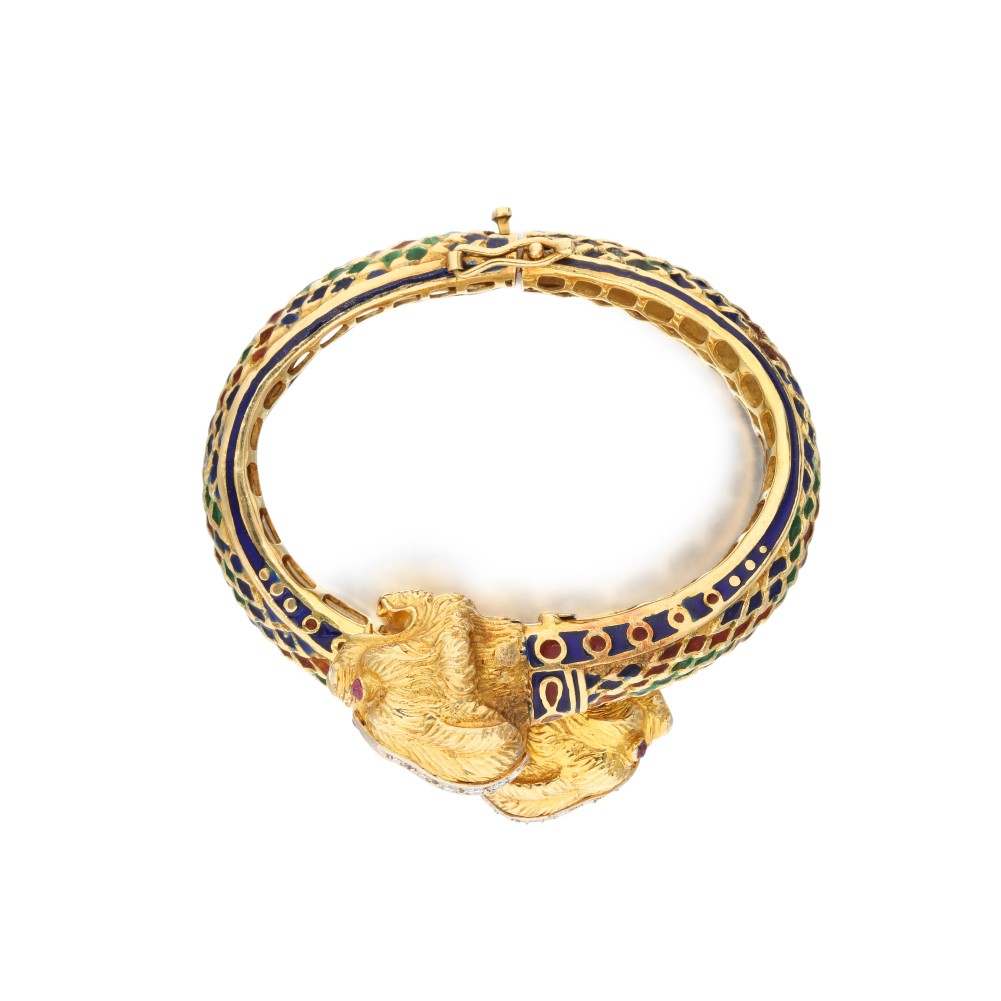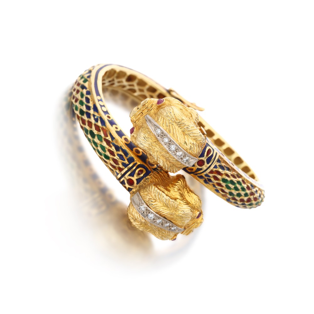 Designed as two chimera heads, set with diamonds and rubies as eyes, accented by enamel.