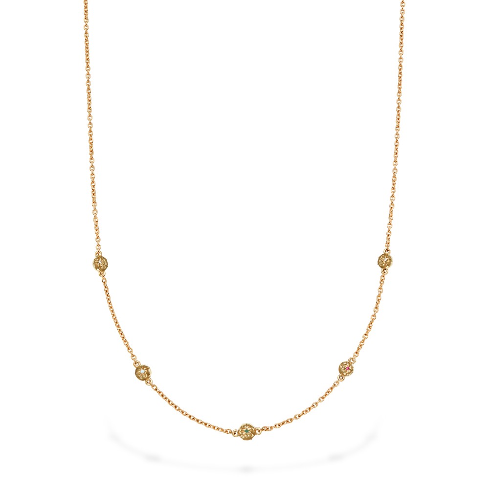 The “Dream” necklace inspired by the Georgian acrostic design, meaning the first letter of each gemstone spells out a word, spelling out the word DREAM with a Diamond, Ruby, Emerald, Aquamarine and Moonstone.